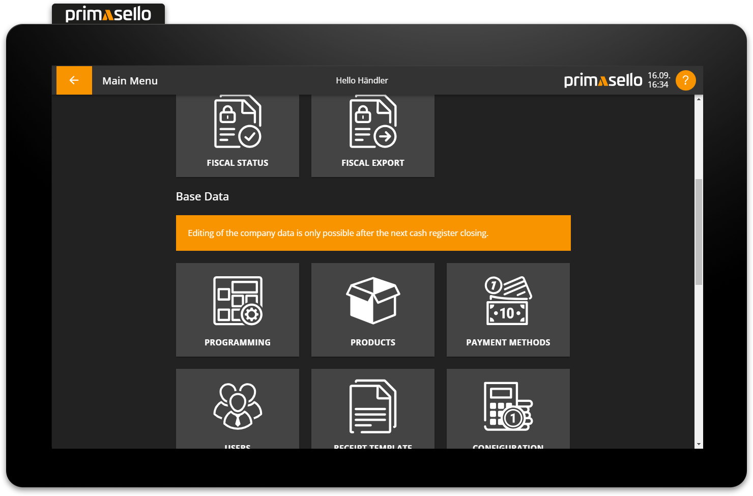 Company data can only be edited after the cash register has been cashed up. If there are receipts that have not yet been archived with a cash up, information about the company, location, cash register and security module can be viewed but not edited, created or deleted.