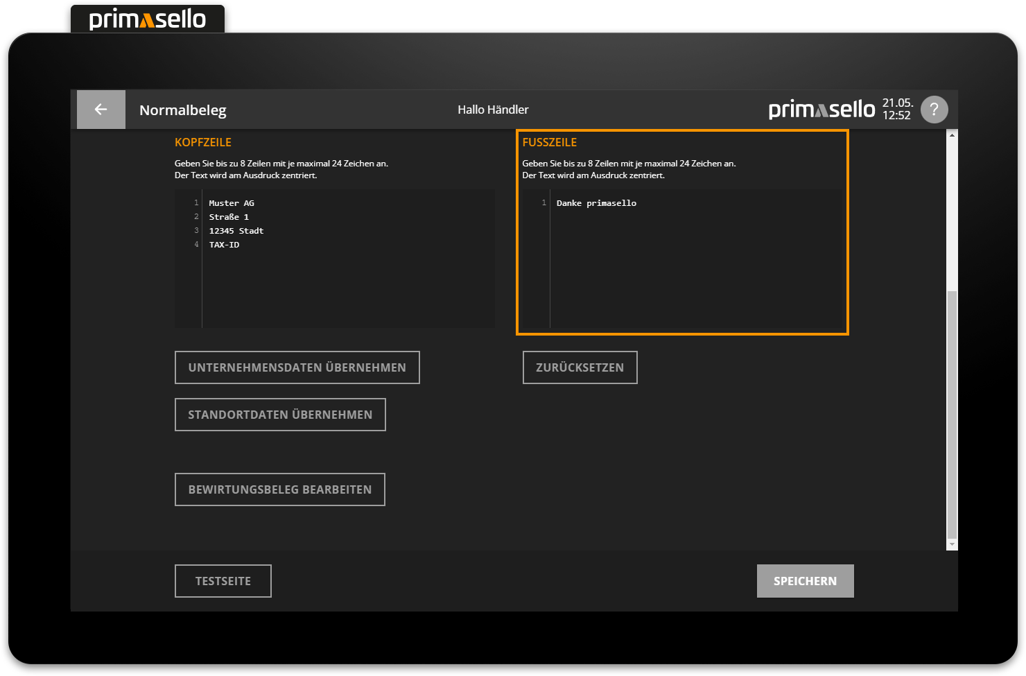 Up to 8 lines can be defined above the actual document printout, which are printed on it as a header. Each line can be up to 24 characters long. The system automatically pre-fills the company data that was entered during the initial setup. You can edit these lines by clicking on them. Once the maximum character length of a line or the maximum line length of the header has been reached, no further entries can be made.