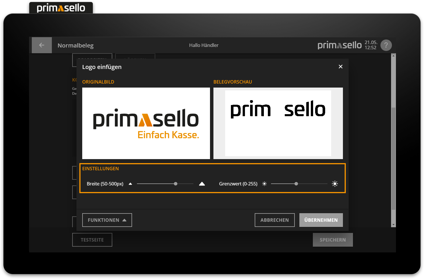 To upload a logo file, you have to select “Choose new image” under Functions. You can choose an image from the device's memory or from a connected external storage medium. The uploaded image is displayed on the left side of the window under the heading original image. Each logo file is converted by the system into a black and white image that can be printed by the receipt printer. The receipt preview of the logo is displayed to the right of the original image.