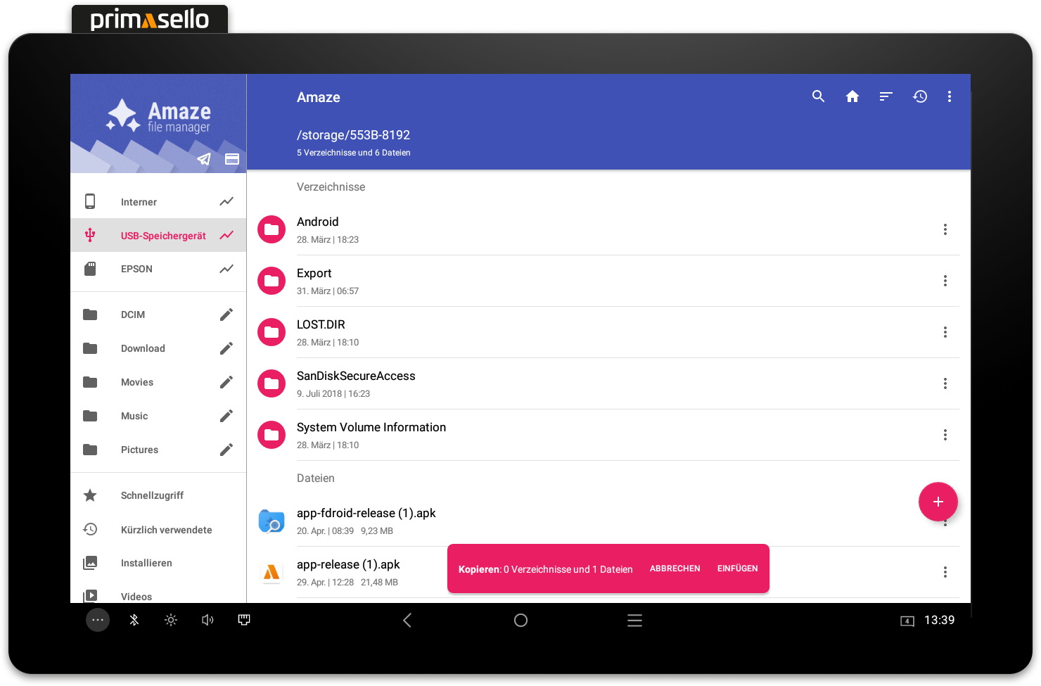 The ‘Amaze’ app opens, where file management is carried out. On the left-hand side, you can select the storage location in the folder directory. Pressing ‘USB storage device’ displays the contents of the USB stick on the right-hand side. Here you can select the file you want to upload. As soon as you press the entry for the desired file, the ‘Amaze’ app closes and the file is uploaded to the primasello cash register.