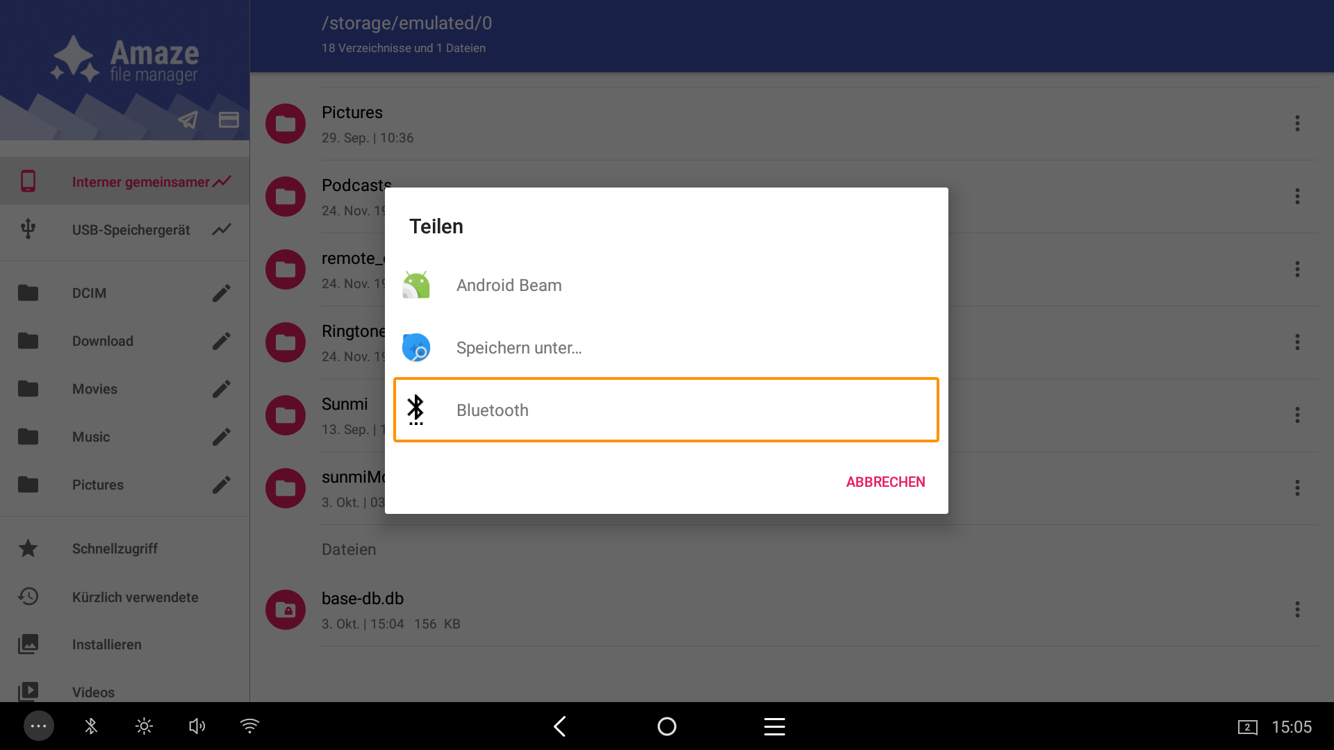 If a file, e.g. a database backup, is to be loaded from a USB stick, a window appears at the bottom of the screen when the function is executed, displaying a selection of available storage media. Here, select ‘Amaze’ to access the data on the connected USB stick.