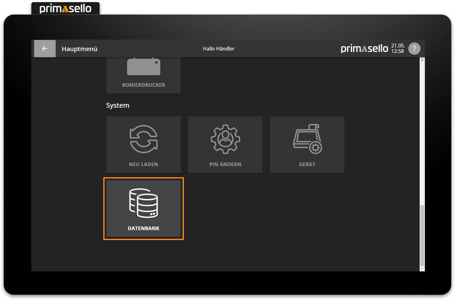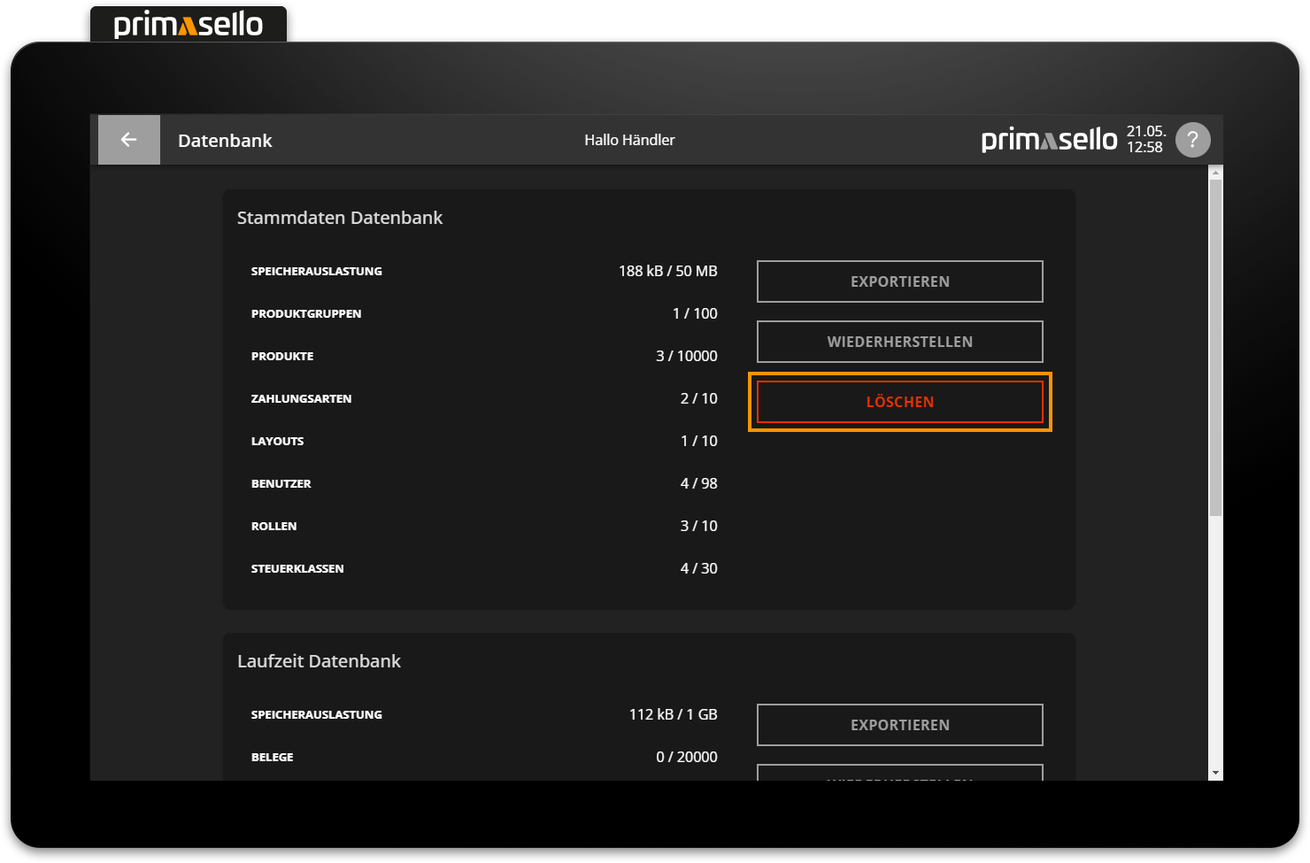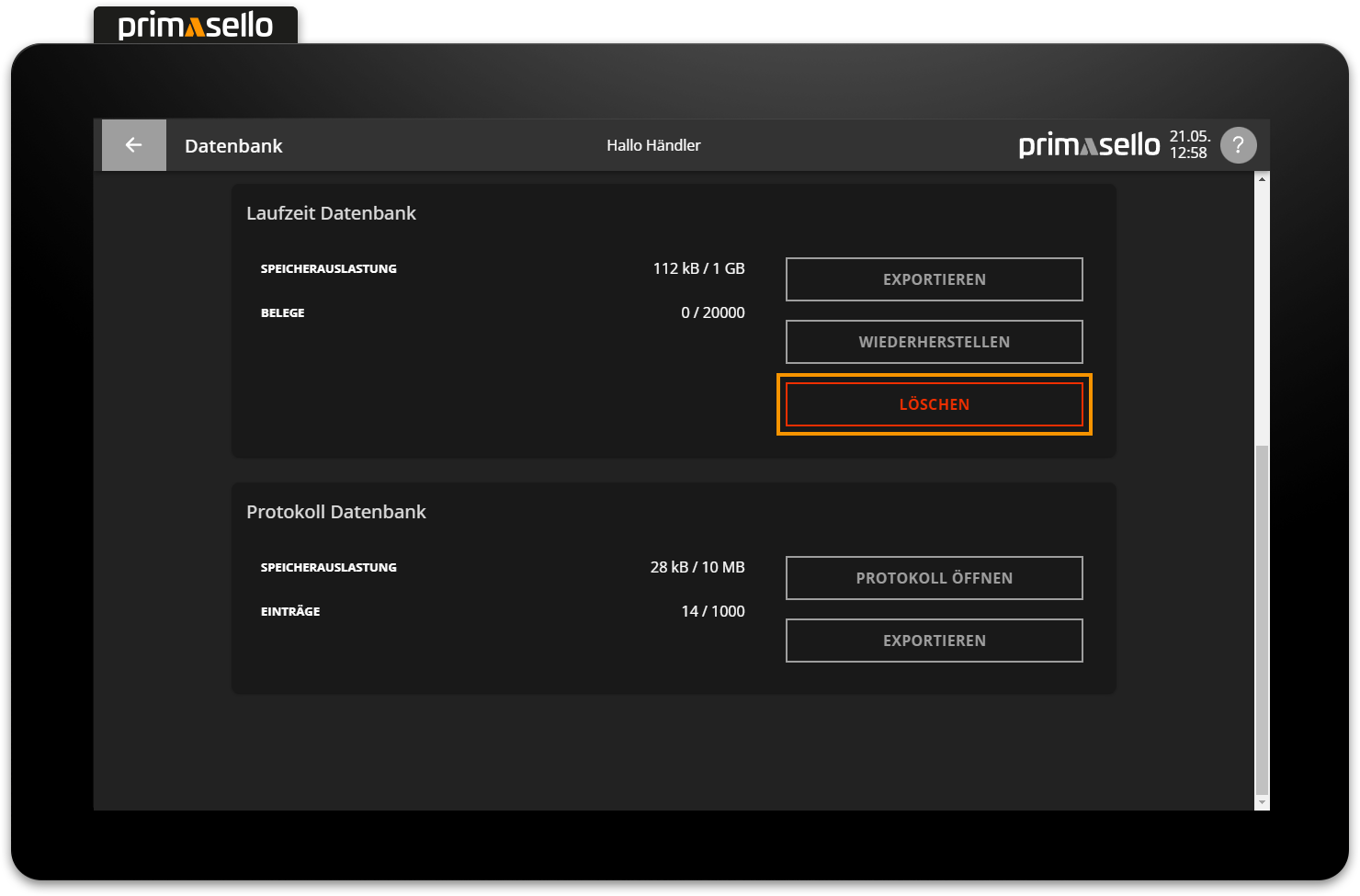 Deleting the database will cause the system to fail and all data will be lost! The primasello cash register can only be used again once a new database has been created or an existing backup has been uploaded. Deleting the database cannot be undone!