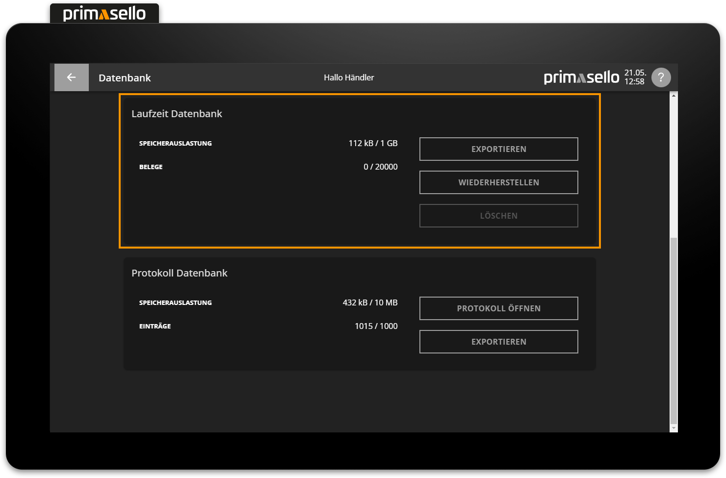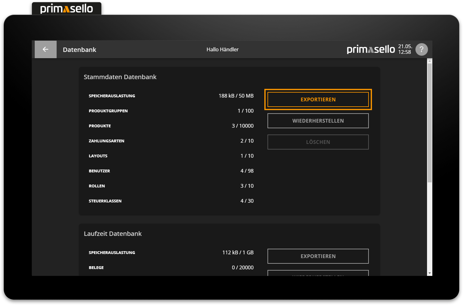 The primasello cash register has two databases in which all system data is stored: master data and runtime data.