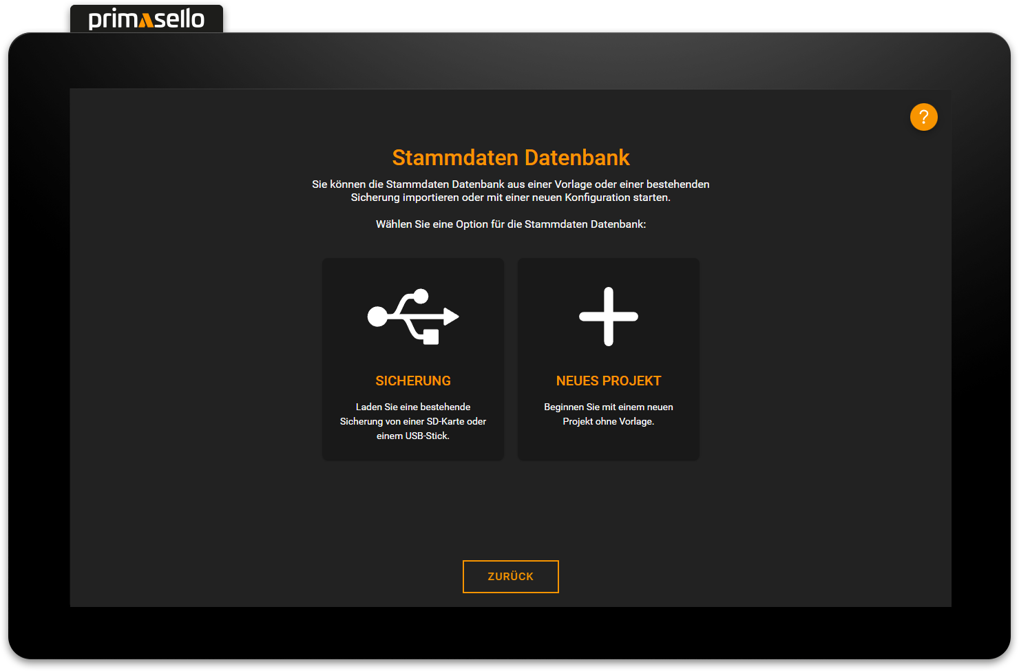 The project stores all programming and configurations of the register. This includes adjustments to the register interface, products, tax classes, payment methods and users. When starting up, there are two options available for a new project, which are described in more detail below. Press the desired setting to proceed to the next step of the start-up process. The master data in the project can be adjusted at any time after start-up. Backups can also be created and used for new start-ups.