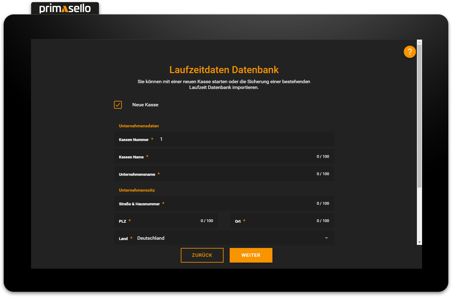 The next step is to enter the company's details. The company details are stored in the runtime database. The new primasello cash register can be given a name and a number to make it easier to identify within the company (especially if there are several registers). This information is stored or printed on every receipt. The company data entered here is used as default for the receipt template and printed in the header of each receipt. The company data and the receipt template can be changed at any time later.