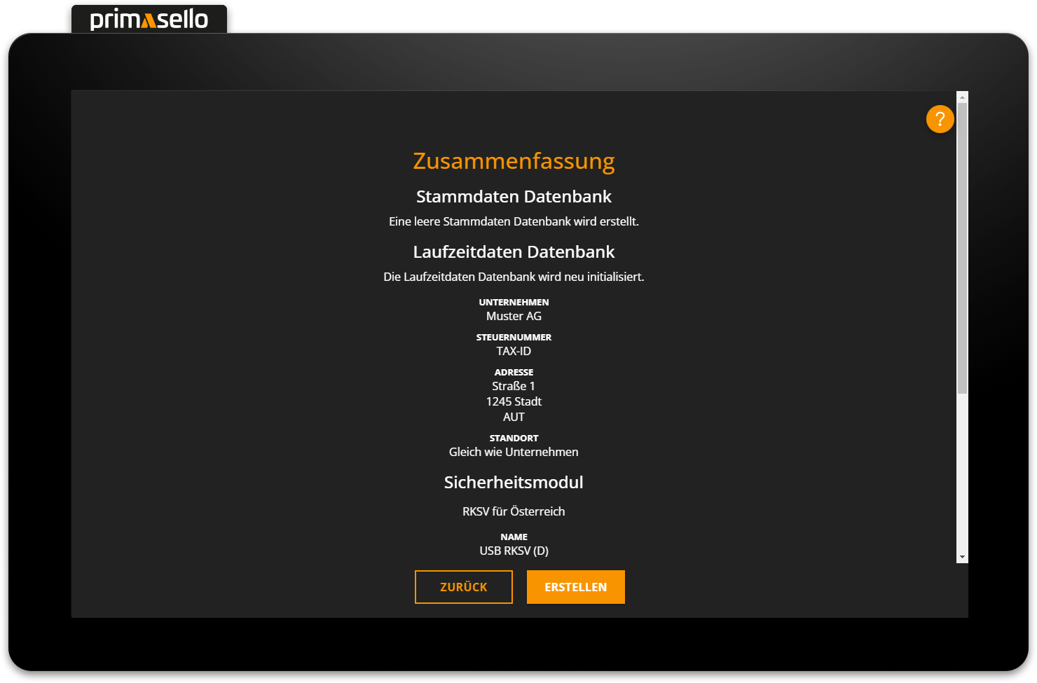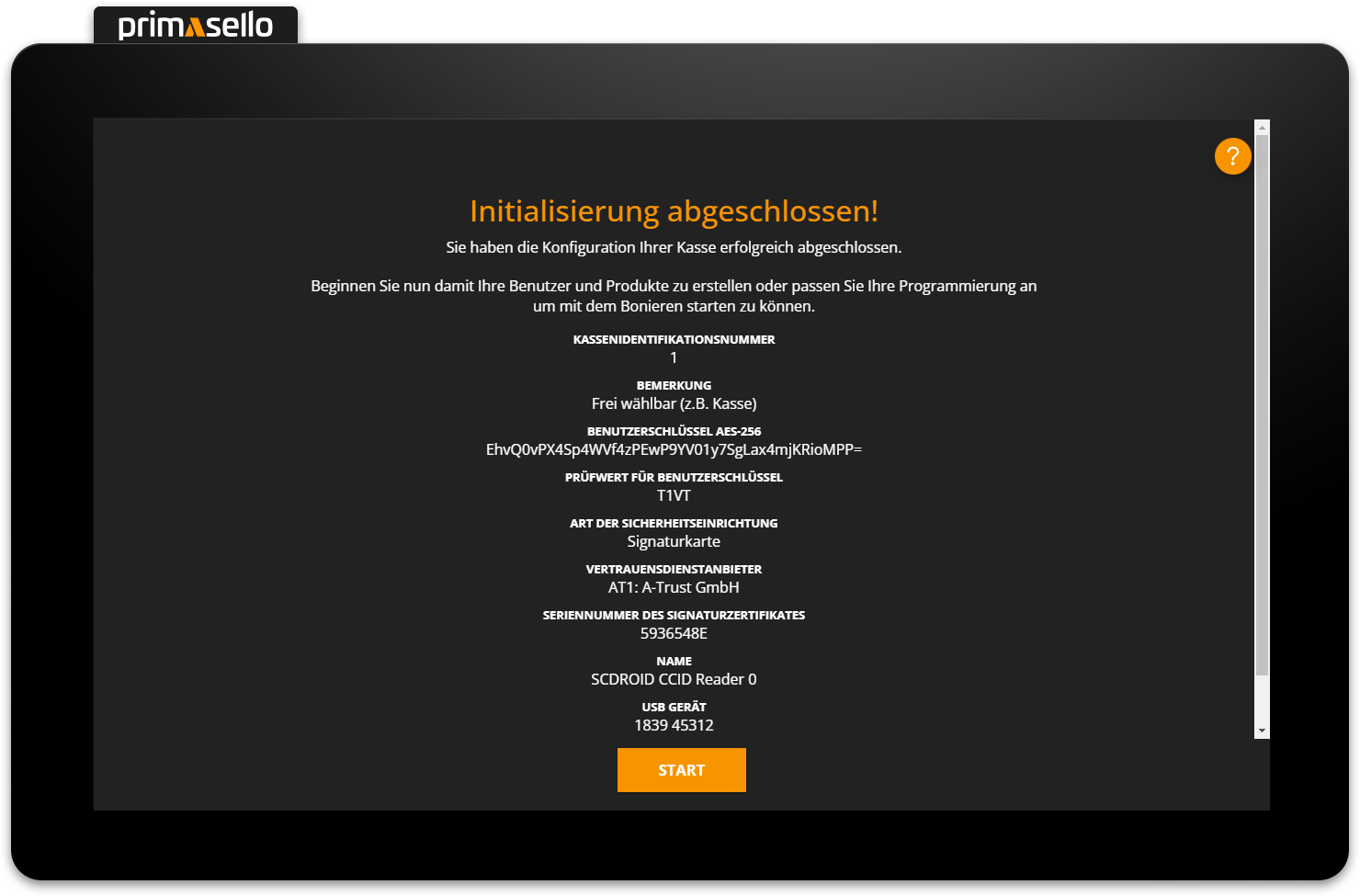 The RKSV is used exclusively for cash registers in Austria and is supplied by primasello ready for use with the device. You can find out how to set up your primasello cash register for use in Germany in the chapter Initial Start-Up with TSE.