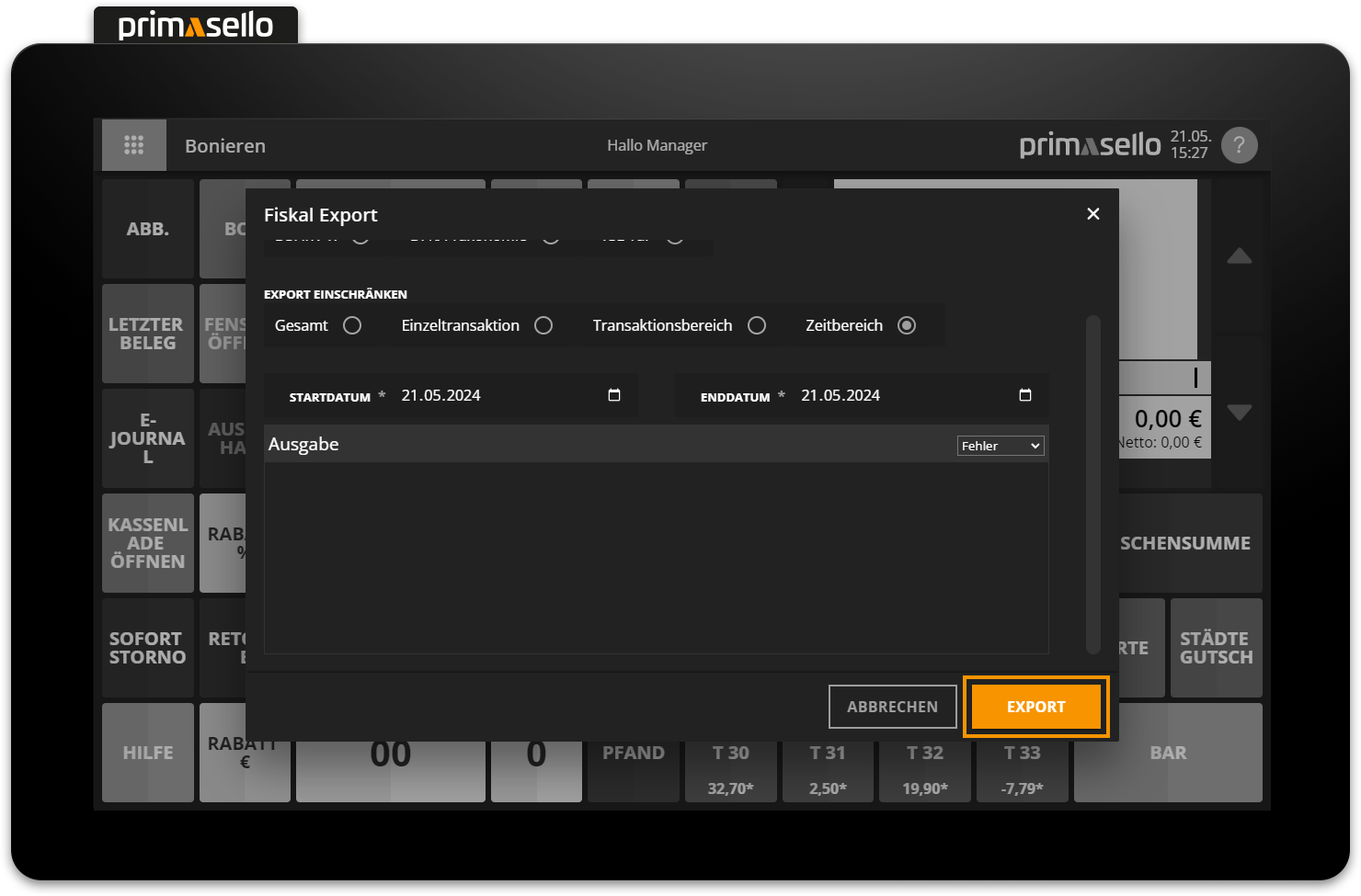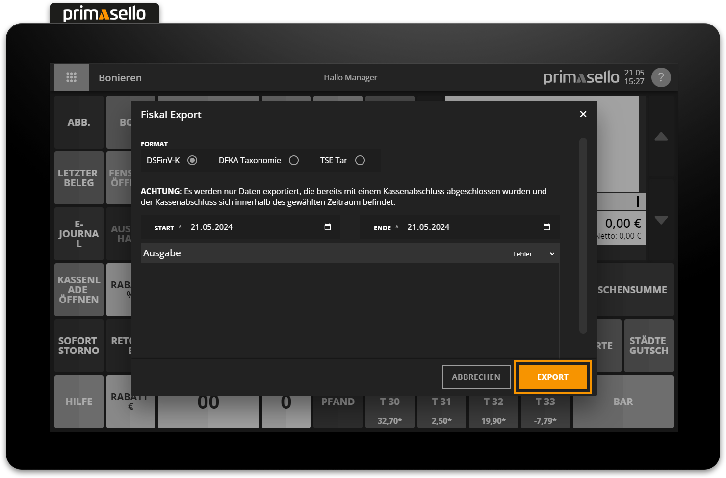 To export the stored cash register data in DSFinV-K format, press the ‘Fiscal Export’ button on the register interface or in the main menu. A window will open where you can export the data.