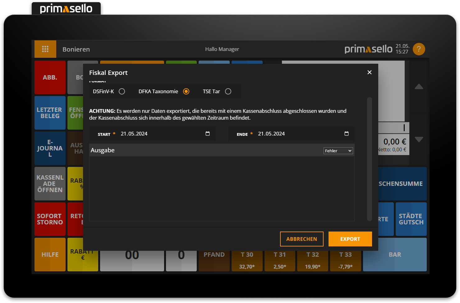 To export the stored cash register data in DFKA taxonomy format, press the ‘Fiscal Export’ button on the register interface or in the main menu. A window will open where you can export the data.