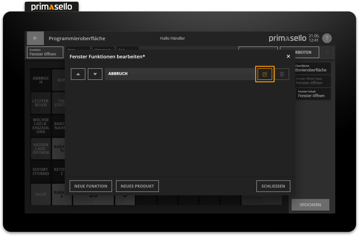 The function entry in a window can be edited in a similar way to a function button on the grid. To do this, press the orange ‘Edit’ icon at the end of the line.