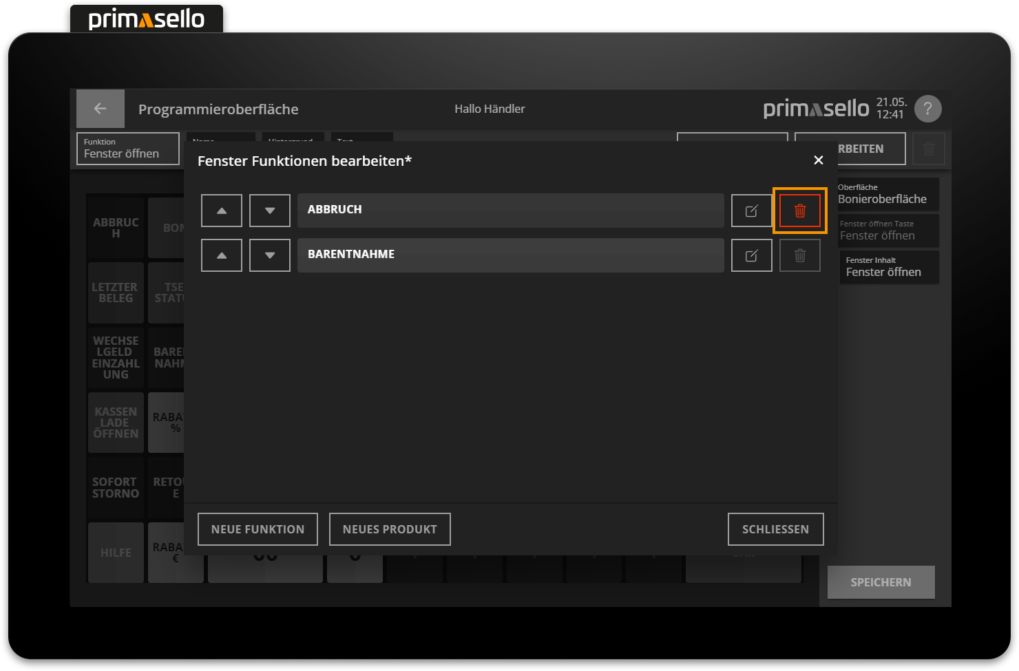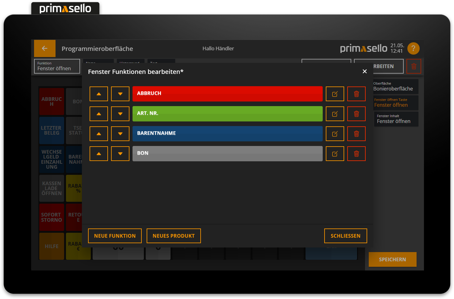 When the ‘Open window’ button is pressed, a new window is opened via the register interface. This window displays additional functions in a list. The same functions and products that are available on the grid can be added to the window. The functions in the list can be sorted, renamed and moved. Any number of ‘Open window’ functions can be placed on the programming interface.