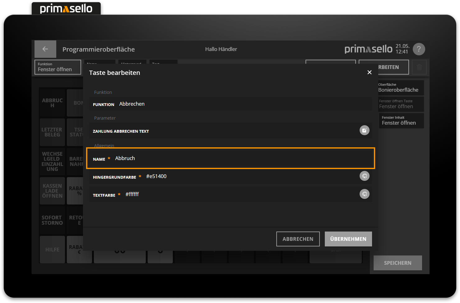 Pressing the orange ‘Apply’ button in the lower right corner saves the functions in the window. Editing a window can be terminated by pressing the ‘Cancel’ button or by pressing the ‘x’ button in the upper right corner - all settings will be lost.