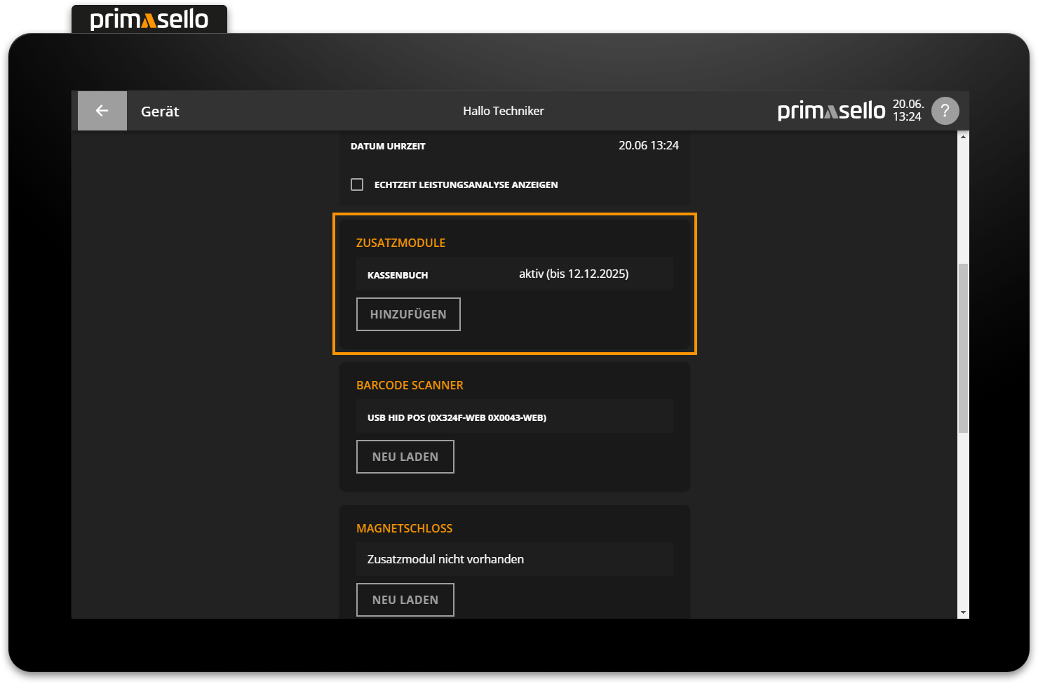 All data relating to the device used can be found under the heading Information. The model and serial number refer to the hardware of the primasello cash register. The information on the app and software version refers to the primasello software components. The data provided here can be requested during support calls. The device information can also be found in the quick help section above the ‘More’ tab under ‘System Information’.