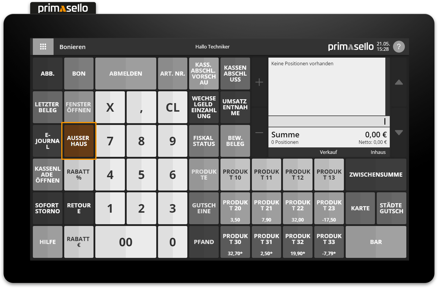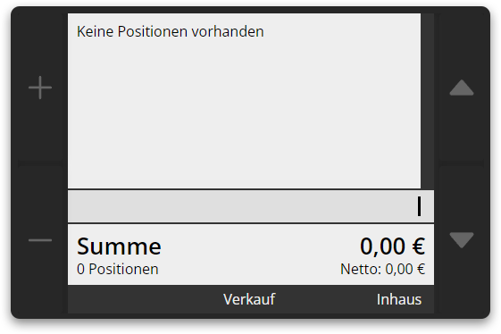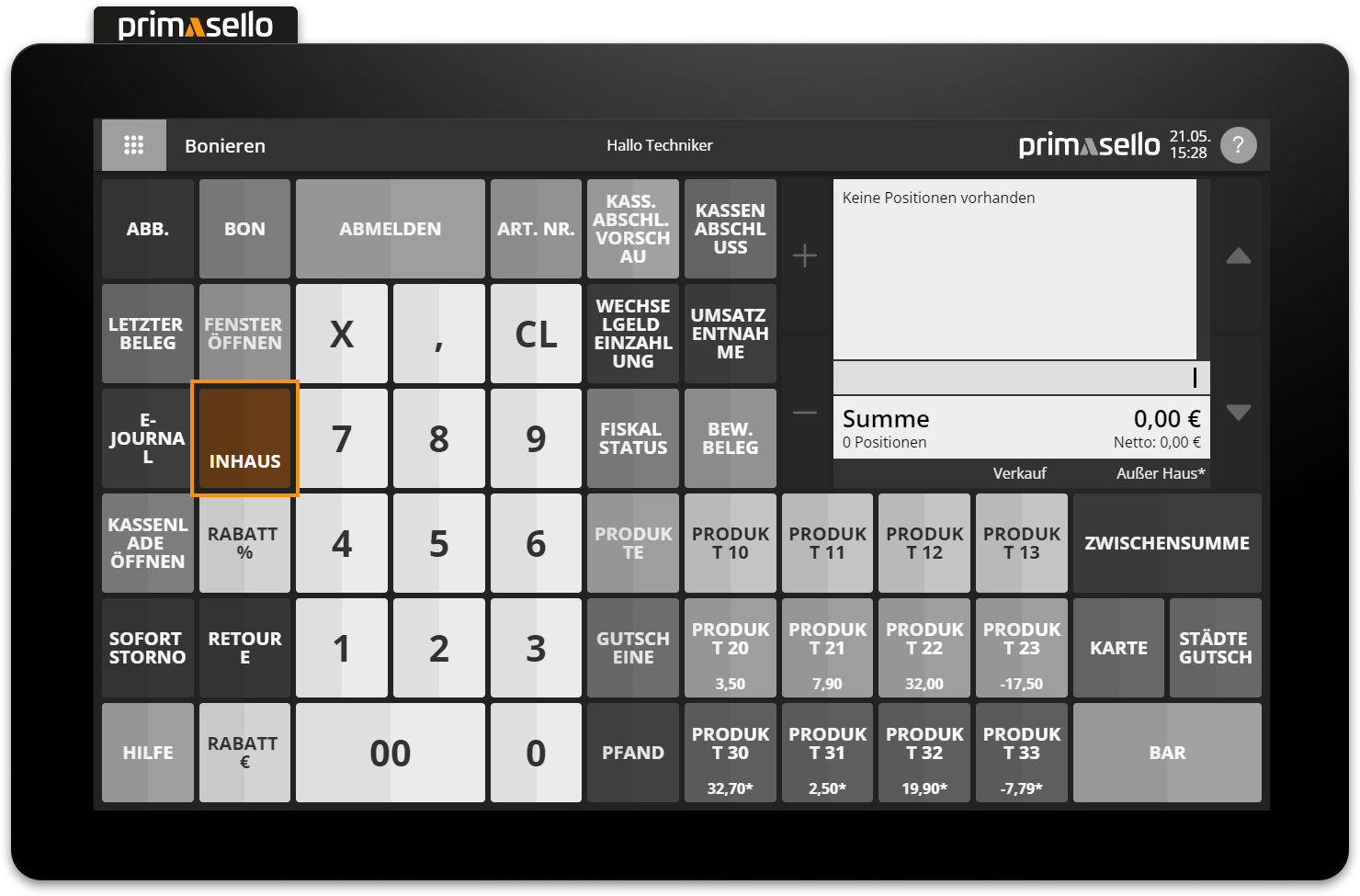 Depending on the business model, the programming can be set to determine whether food and drinks are consumed on site (dine in) or “takeaway” by default. The button on the register interface switches to the other option accordingly. This documentation assumes that products are consumed on site (dine in) by default and that the function button switches to the 'takeaway' option.