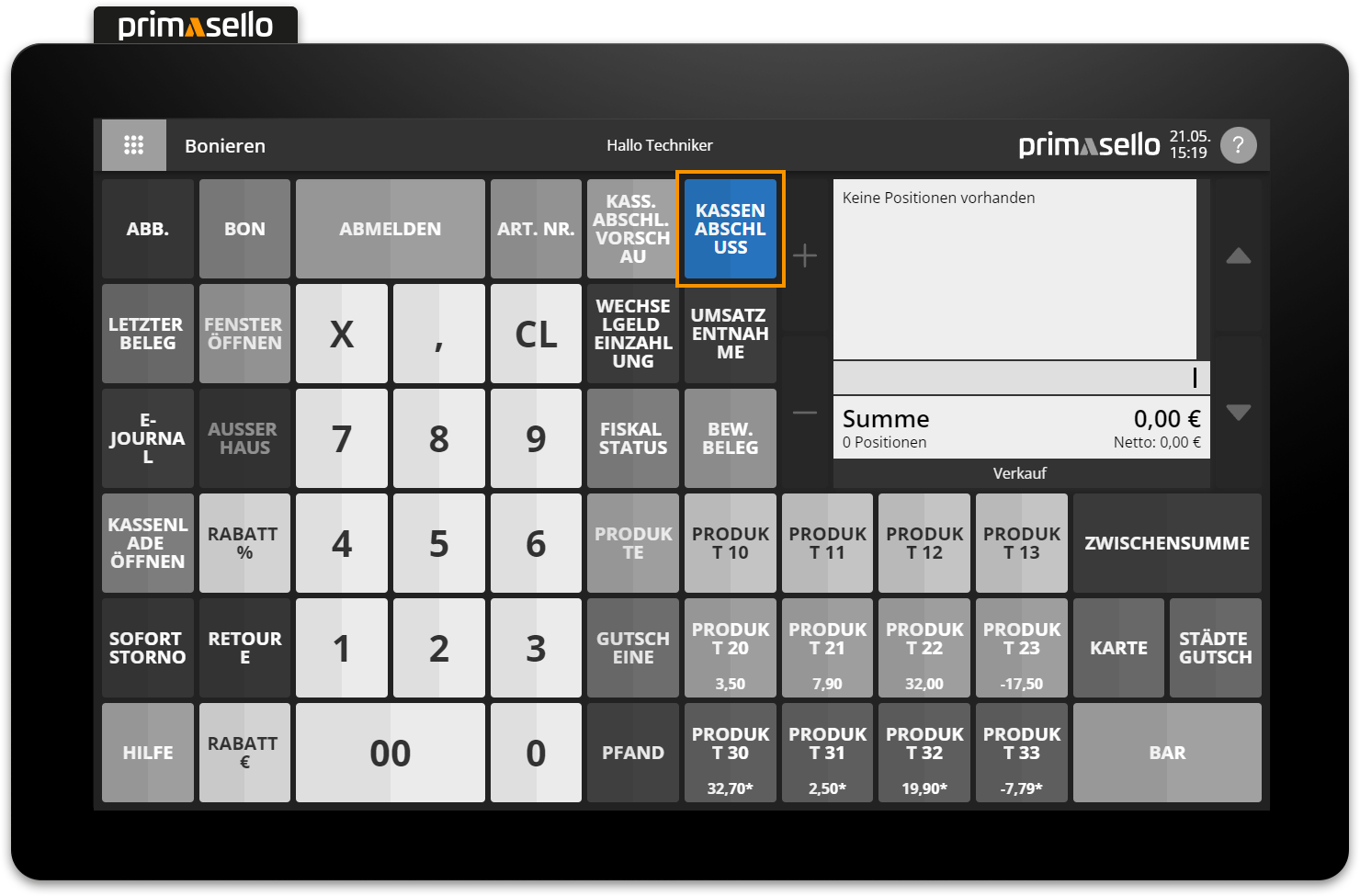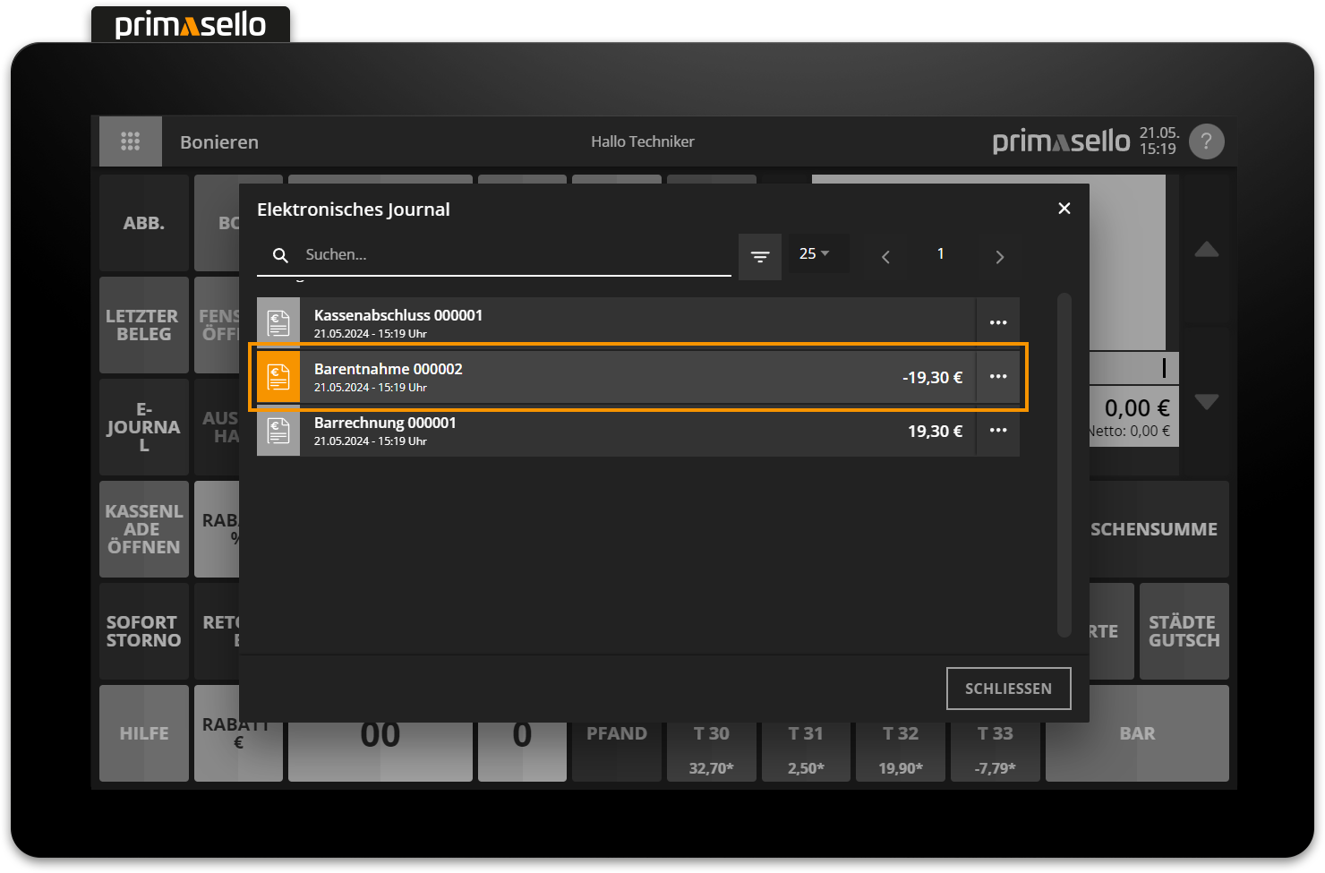 In addition, a cash withdrawal of the cash balance in the register is created and saved as a receipt in the journal.