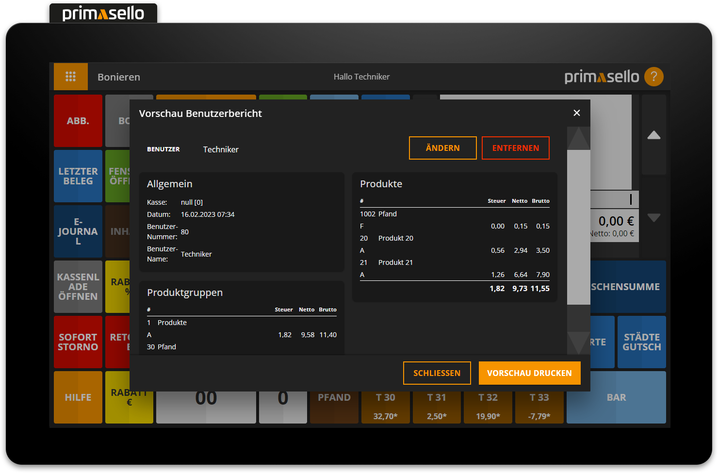 In the preview, an overview of turnovers can be called up at any time without actually cashing up the cash register.