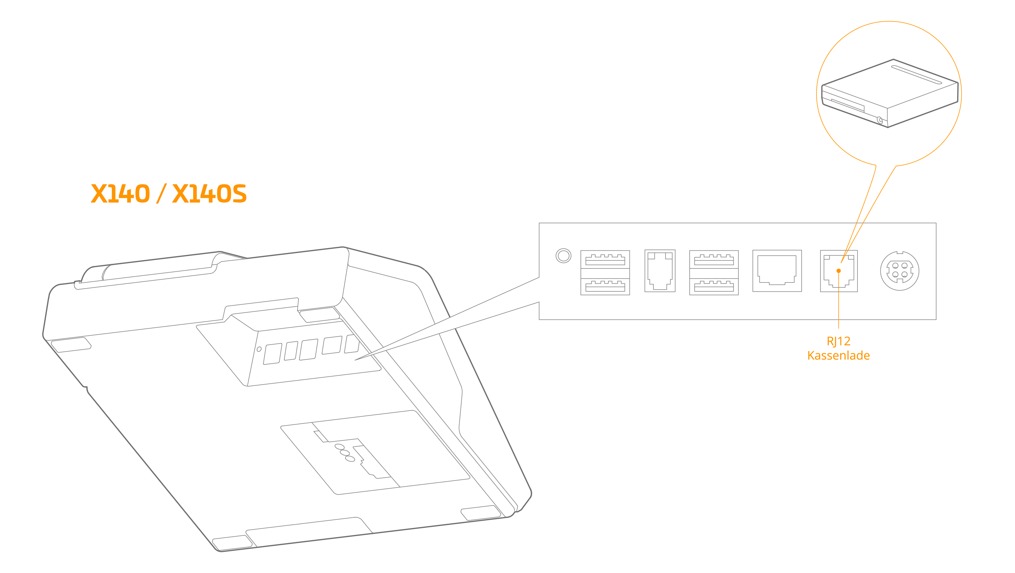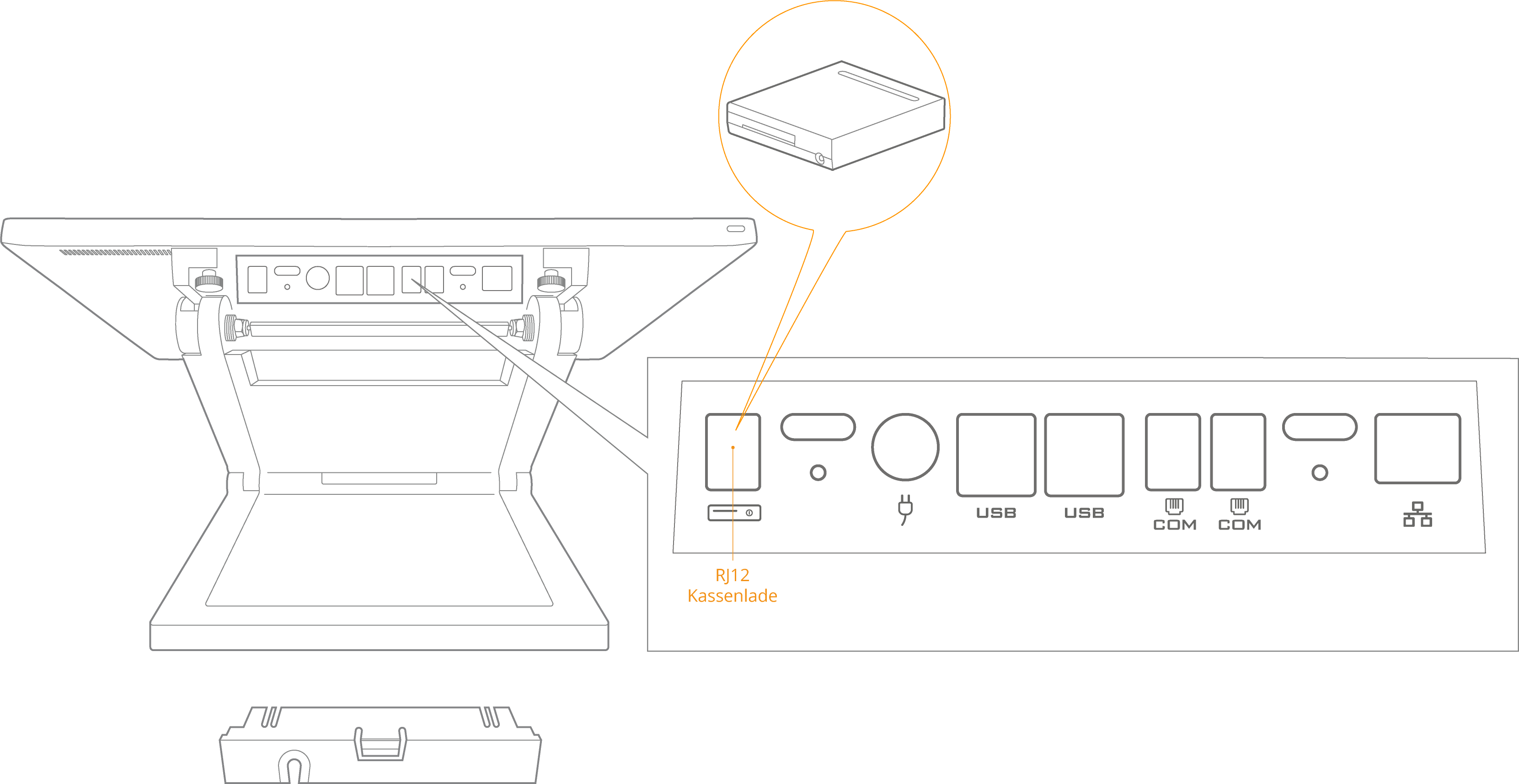 The cash drawer has an RJ12 connector. The connector for the cash drawer is located on the bottom of the primasello cash register and is marked with a small cash drawer symbol: