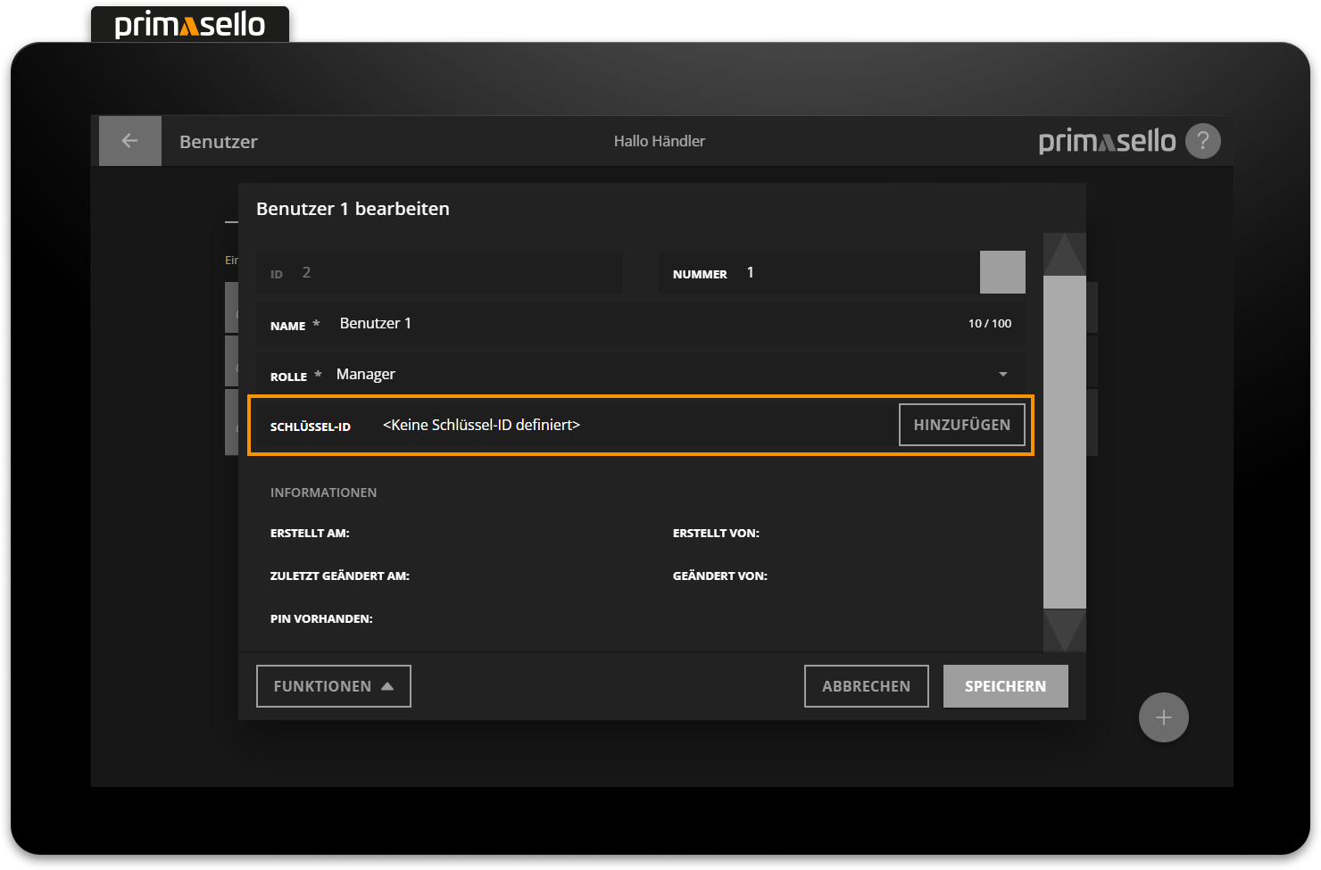 When creating or editing a user, a window opens with the user's details. The ‘Key ID’ field is located in the bottom line. If no key is stored, the text <No key ID defined> is displayed.