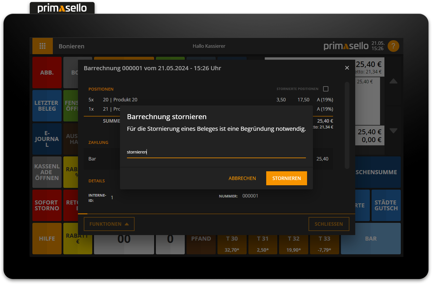 This contains the red ‘Cancel’ button. When this is pressed, a window opens asking you to enter a reason for the cancellation. You have to enter the reason and confirm it with the ‘Cancel’ button. This is printed on the cancellation receipt and stored in the electronic journal.