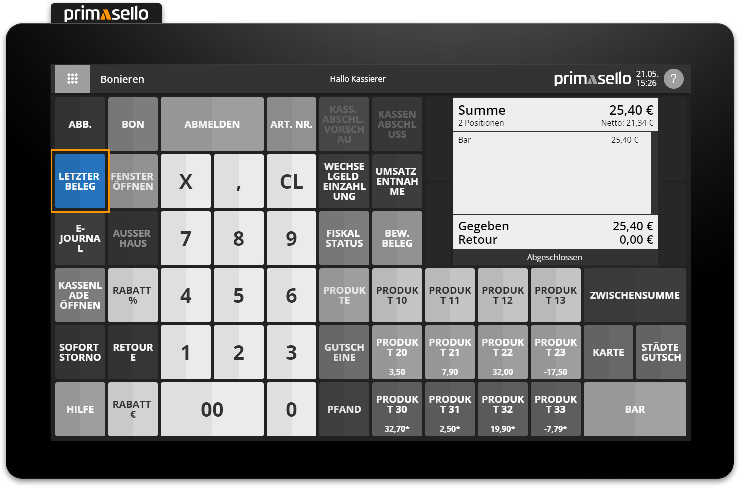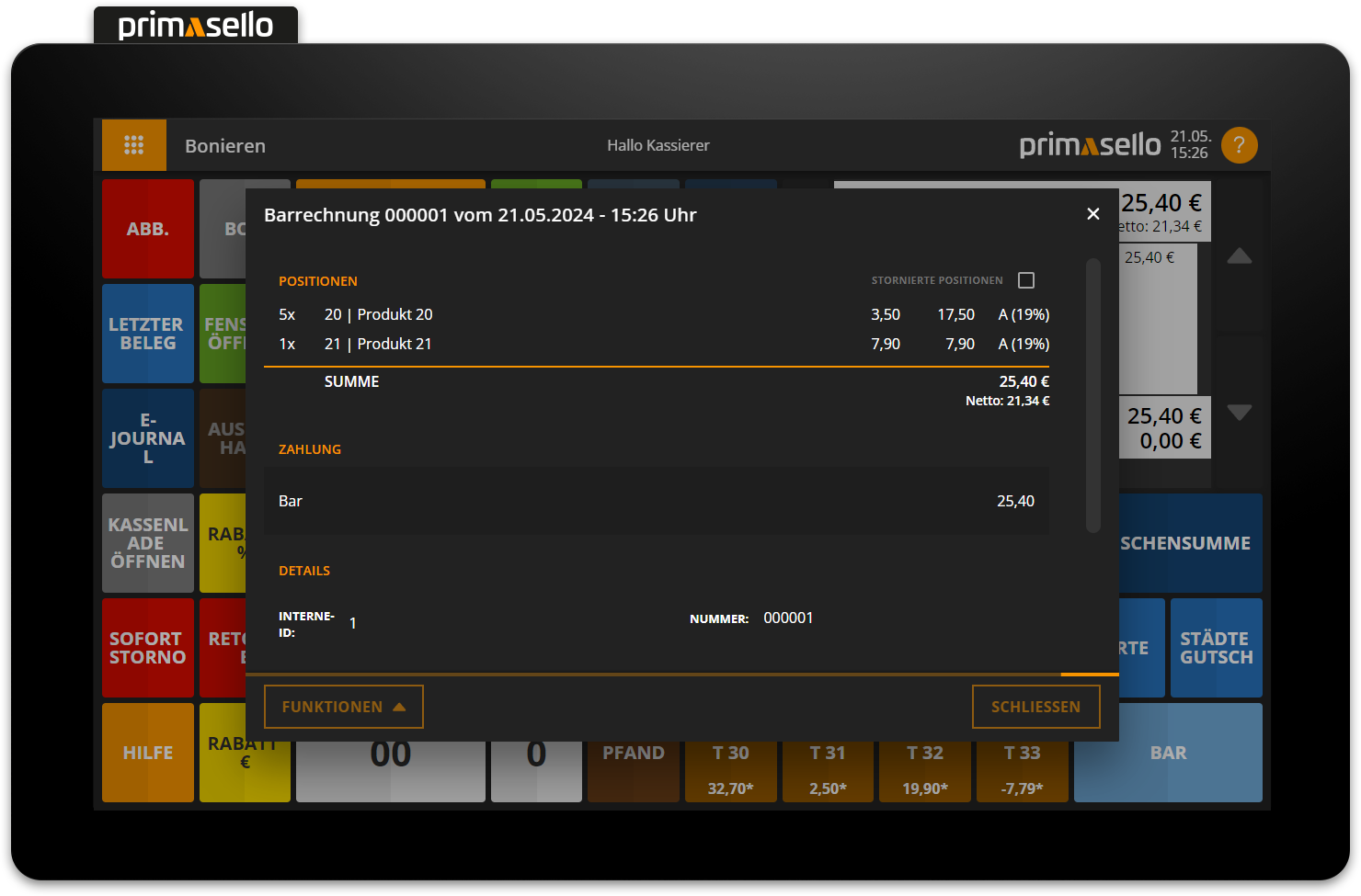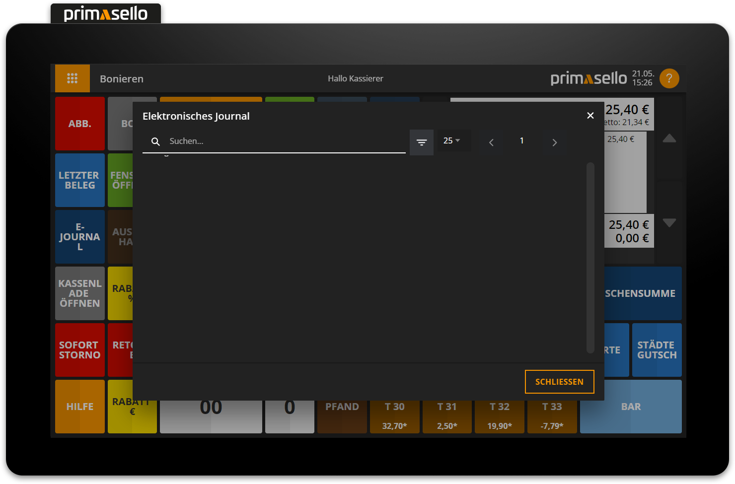 To cancel a receipt, you have to open it in the electronic journal. If you want to cancel the most recently created receipt, you can open it using the ‘Last receipt’ button.