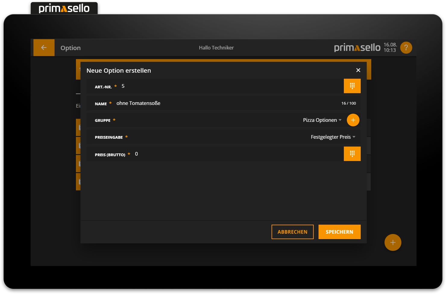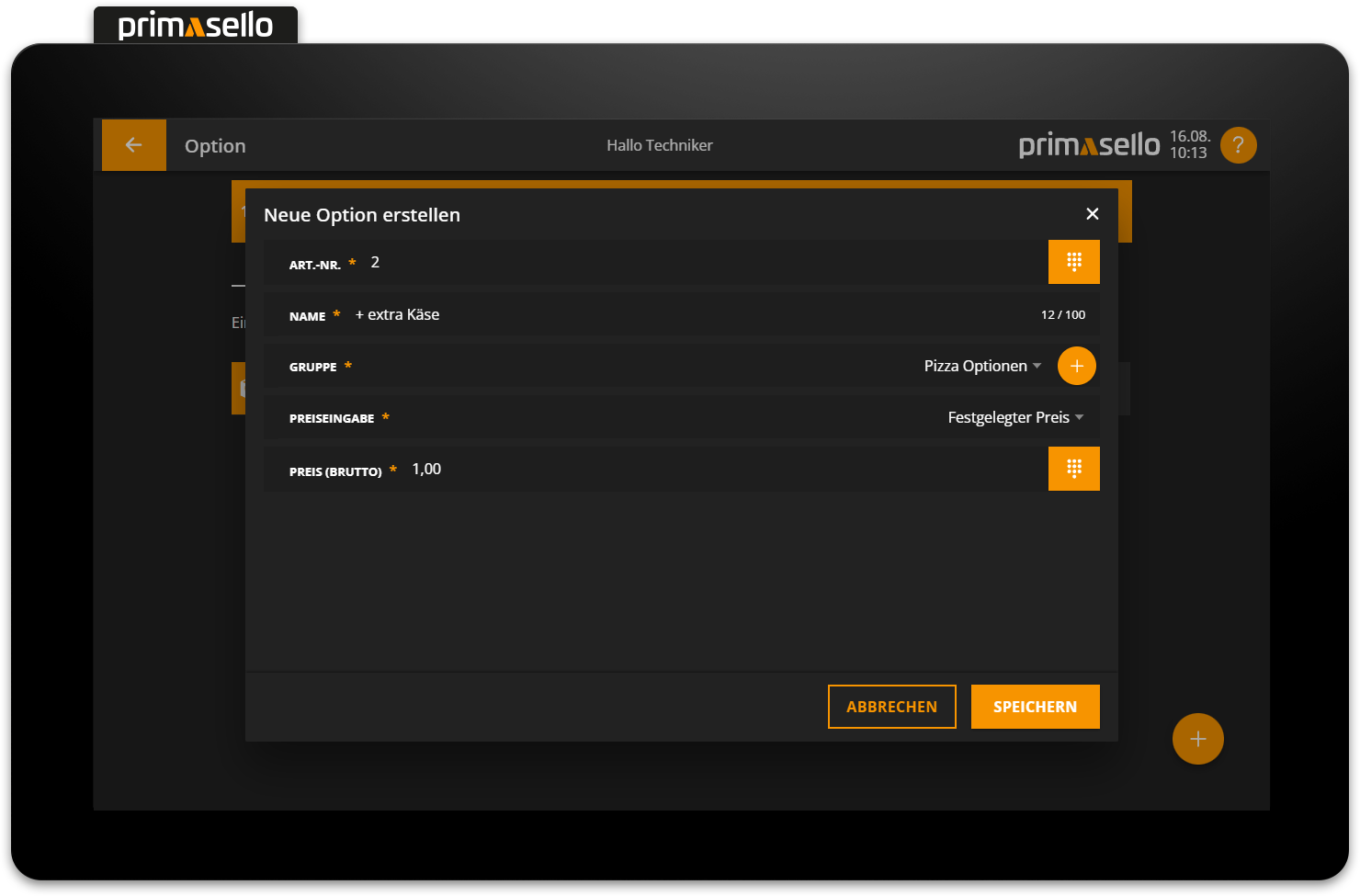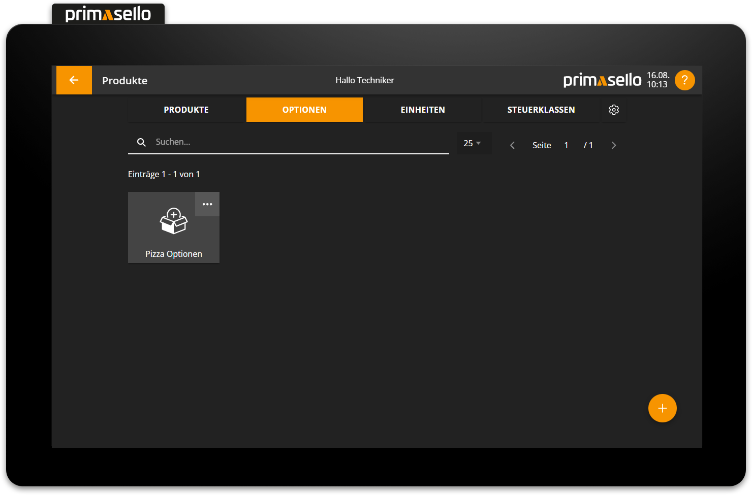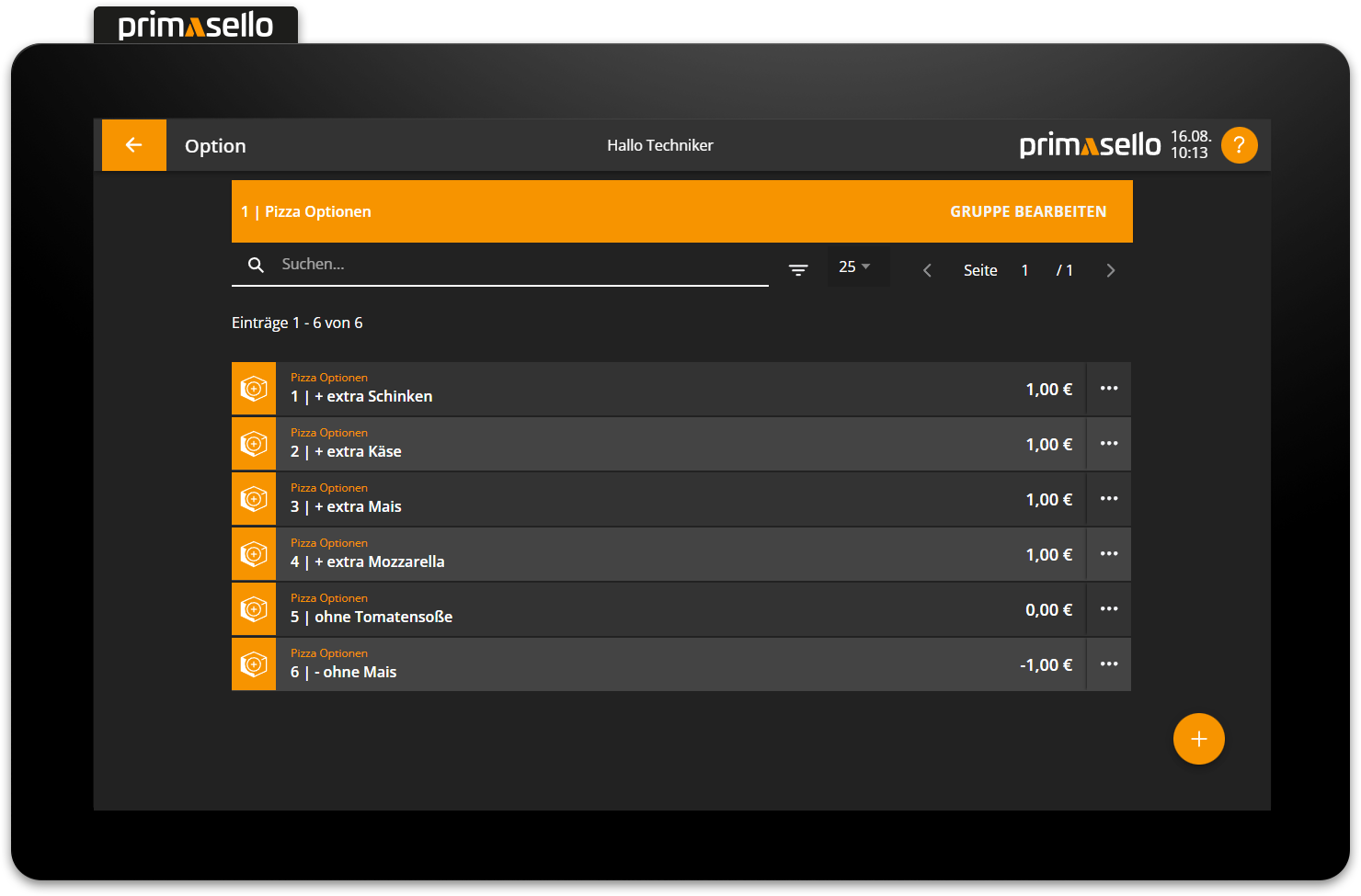 This chapter describes how to create and manage options. Options can be used in the primasello cash register to add additional options to products (e.g. extra cheese on a pizza).