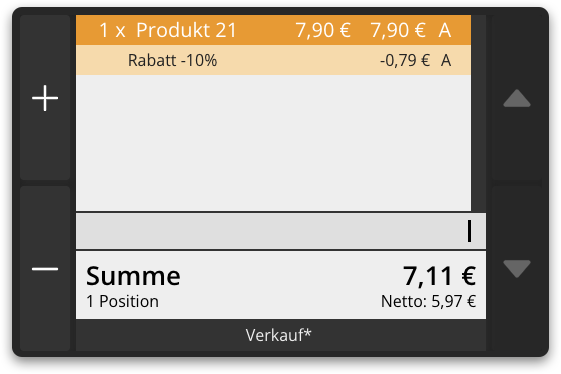 If you want to correct the percentage or amount of a discount, you can replace the original value by re-entering it. To do this, you have to select the item (product or subtotal). Then enter the desired new percentage or amount using the numeric keyboard and add it by pressing the corresponding discount button. The old value is replaced by the new one. In this way, the discount type can also be changed by overwriting it.
