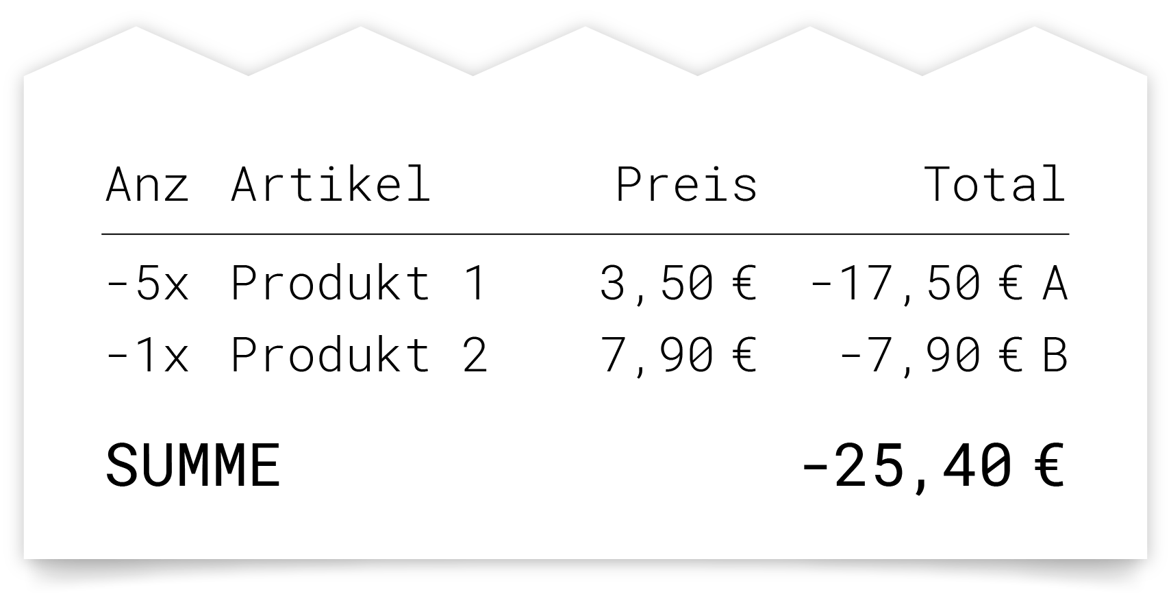 To process returns of discounted products, discounts can also be registered as usual in return mode. The register automatically converts the negative amount of a discount into a positive amount, which is added to the negative total of the receipt.