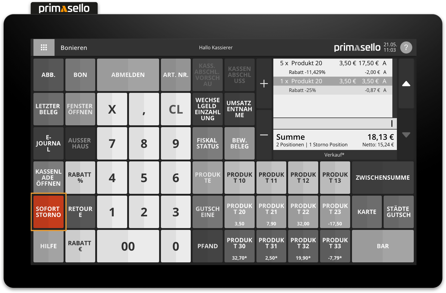 Discount € | The discount AND the associated item (subtotal or product) are deleted. The receipt total is increased by the amount of the item. | Sale |