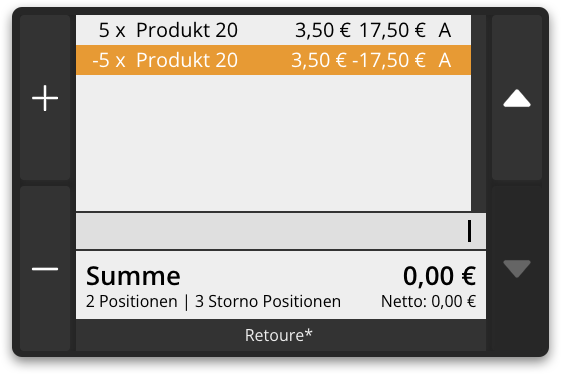 Pressing the “remove line” button deletes the selected item (highlighted in orange) from the shopping cart. To remove another item from the receipt, the item has to be selected first.