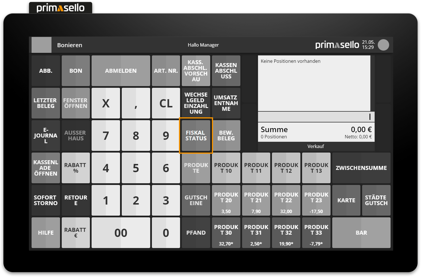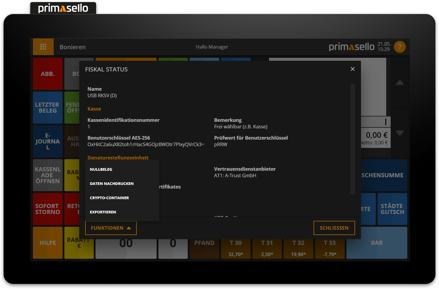 If the register is connected to an RKSV, information about the RKSV can be accessed via the 'Fiscal Status' button on the register interface. Alternatively, the status of the RKSV can be viewed in the main menu via the 'Fiscal Status' button.