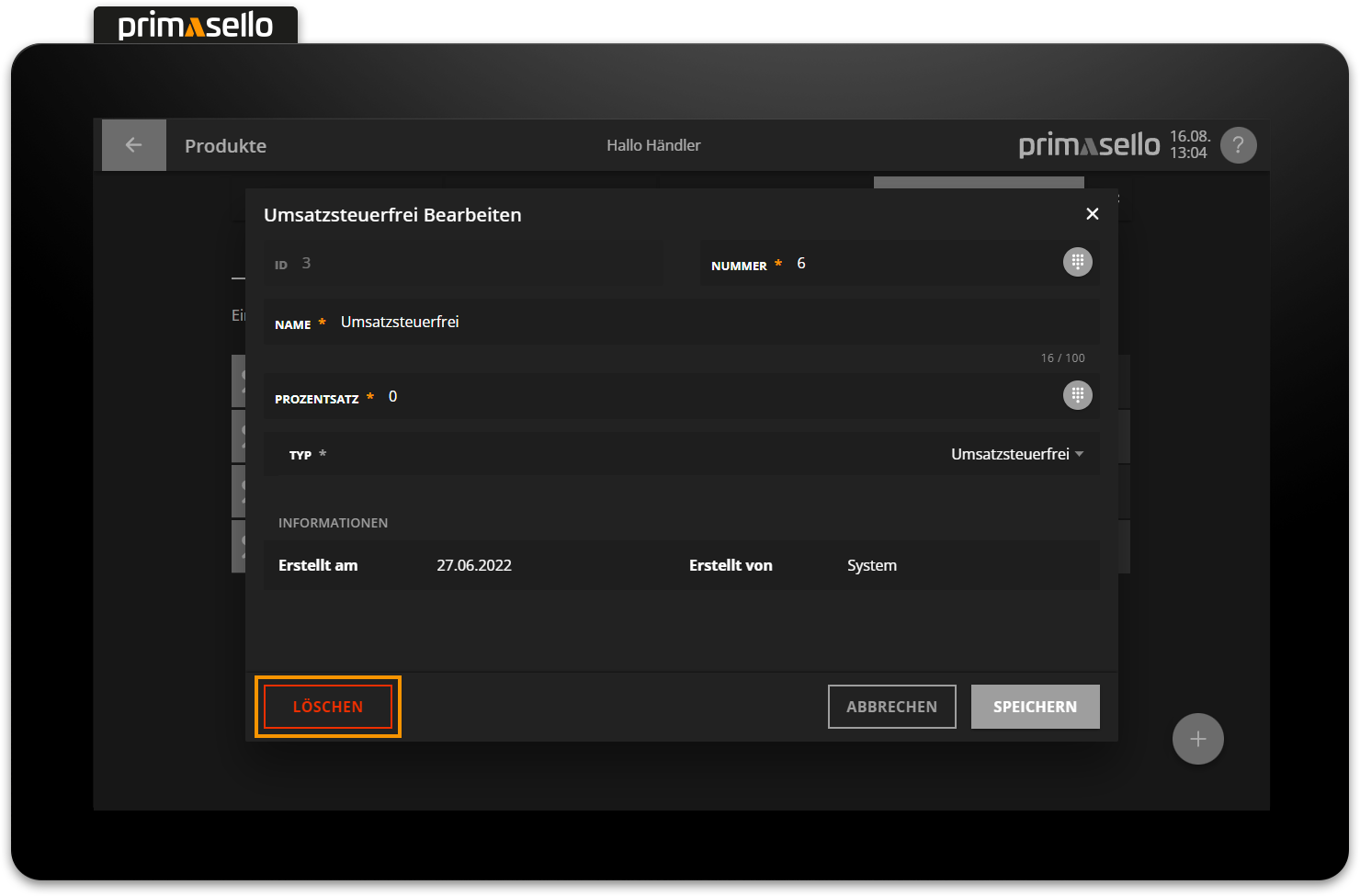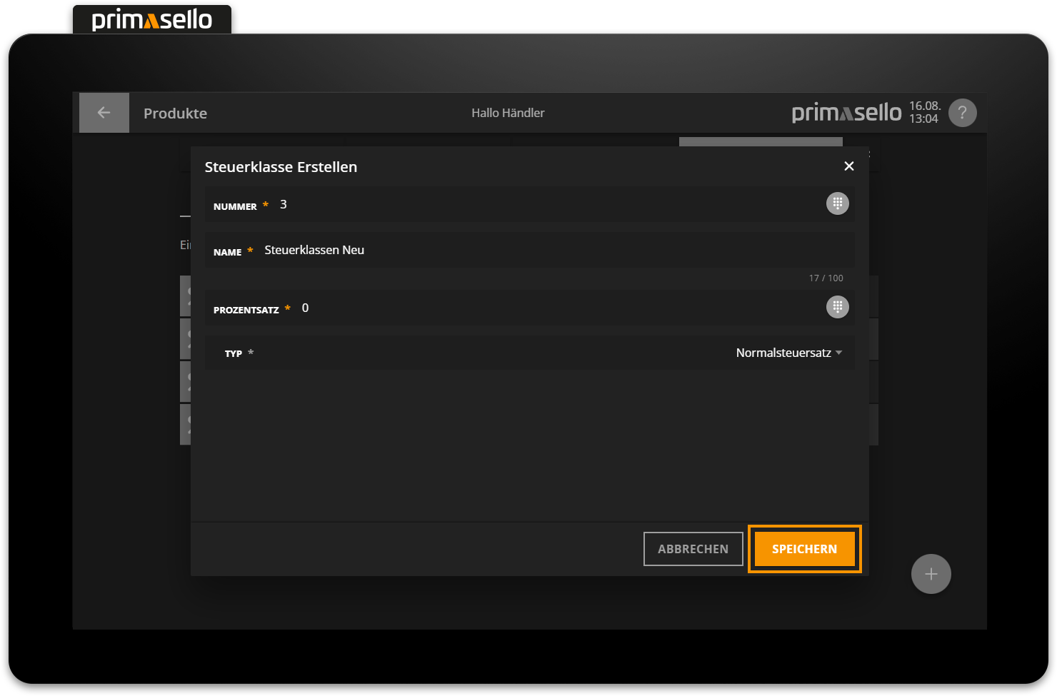 Pressing the orange ‘Save’ button in the lower right corner creates the new tax class and closes the window. Creating a new tax class can be cancelled by pressing the 'Cancel' button or the ‘x’ button in the upper right corner - all settings will be lost.
