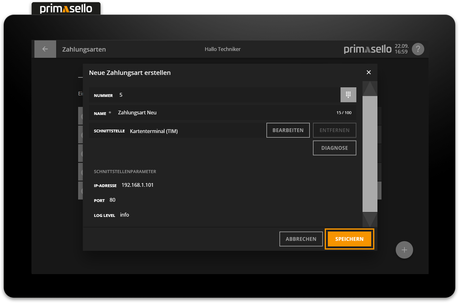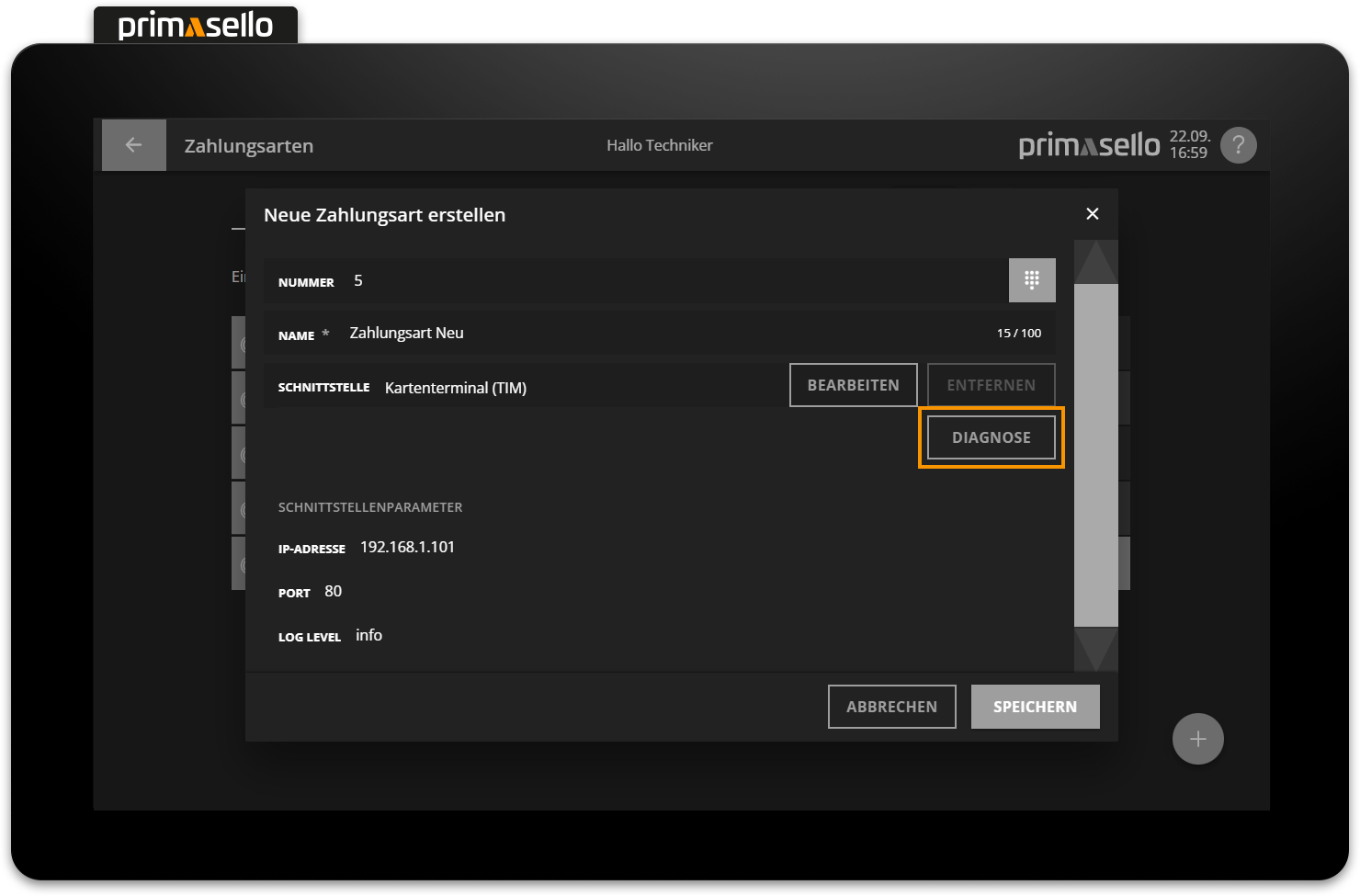 The orange ‘Diagnose' button is located below the ‘Interface' line. This button can be used to check the connection between the card terminal and the primasello cash register at any time. The diagnosis should be carried out especially after changes to the payment method, the internet connection or the terminal have been made.