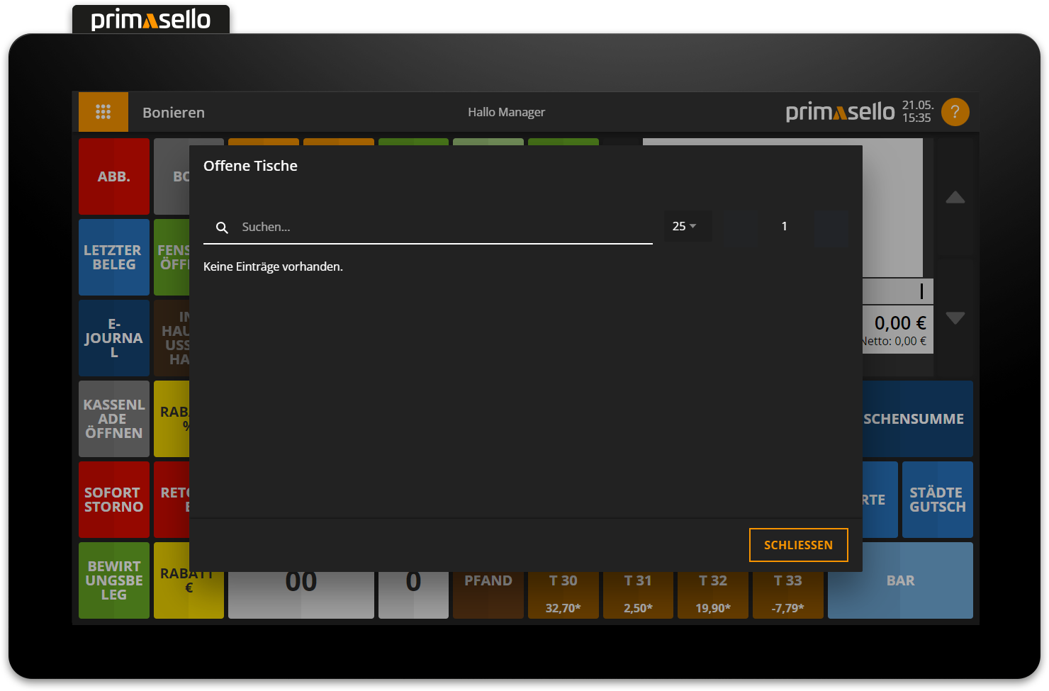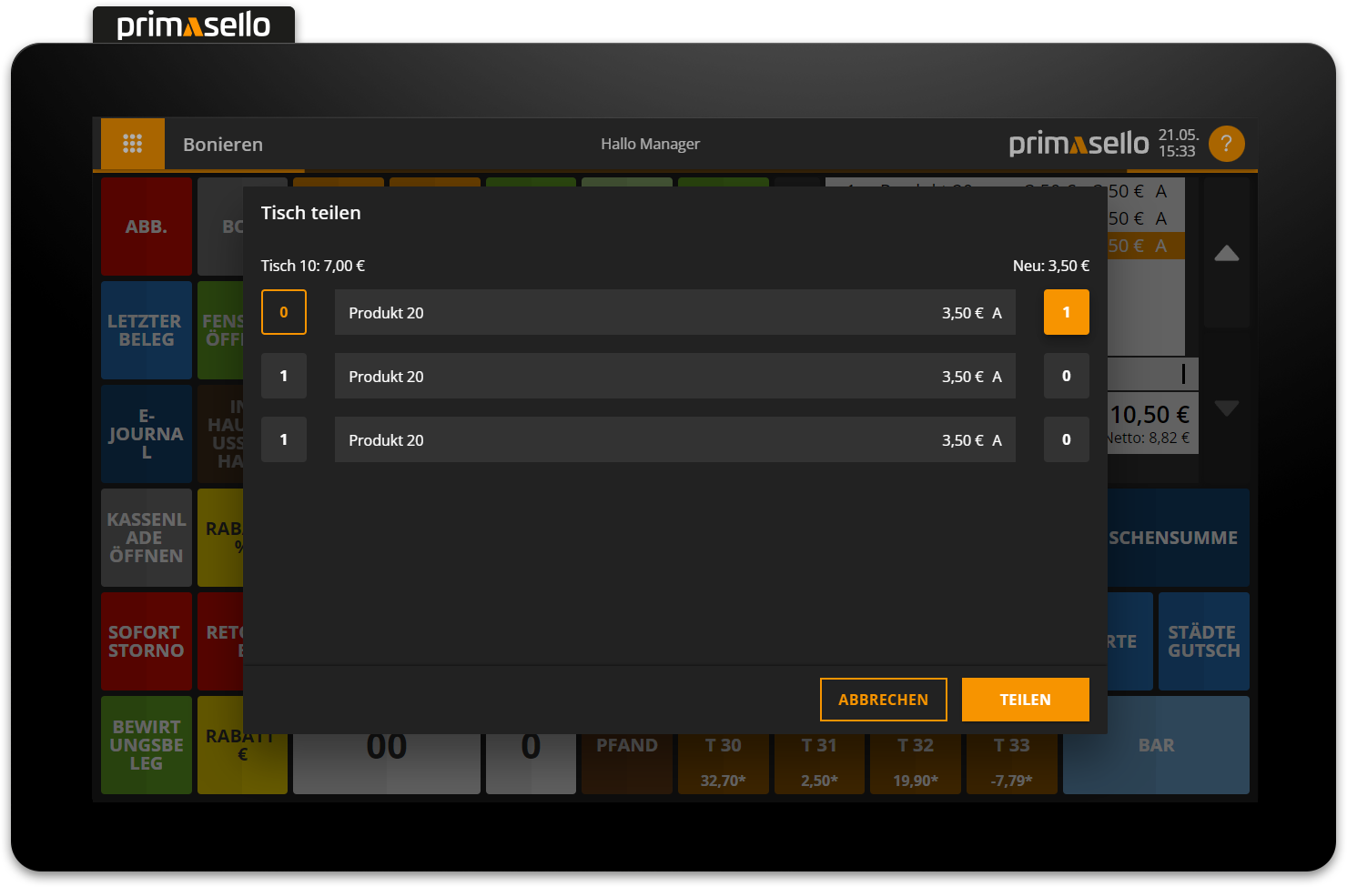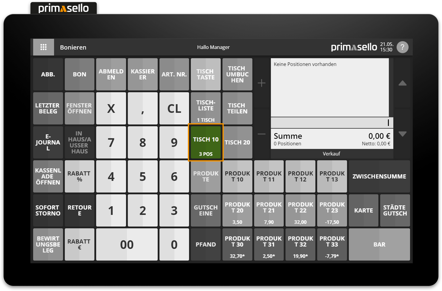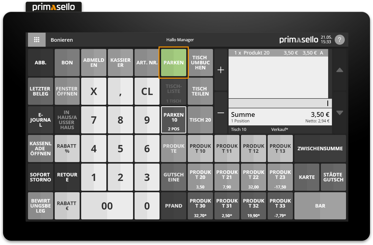 For situations where speed is required, the primasello cash register has a quick park function. To use this, first open a table and add items to the shopping cart. Then enter a new table number using the numeric keyboard and press the ‘Park’ button (previously the ‘Table’ button). The items in the shopping cart are automatically parked at the first table and the new table is opened. This allows you to jump back and forth between different tables without having to open and close the tables individually.