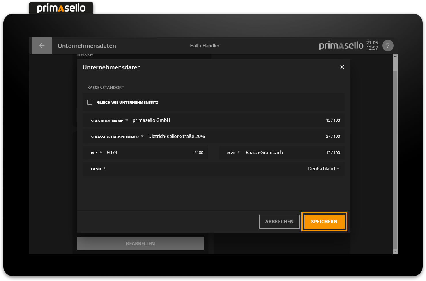 A new window opens in which the name and address of the cash register location can be edited. If these differ from the company data, the check mark for ‘Same as company headquarters’ has to be deactivated. If the check mark is activated, the company data is transferred to the cash register location. Pressing the orange ‘Save’ button in the lower right corner will apply the changes to the cash register data and close the window. Editing the cash register data can be terminated by pressing the 'Cancel' button or by pressing the ‘x’ button in the upper right corner - all changes will be lost.
