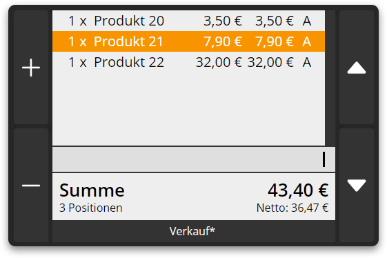 There is a plus and a minus button on the left-hand side. These can be used to change the quantity of the selected item. When entering quantities with decimal places (e.g. 1.3x product 1), the quantity is rounded up or down to the next integer when increasing or decreasing.