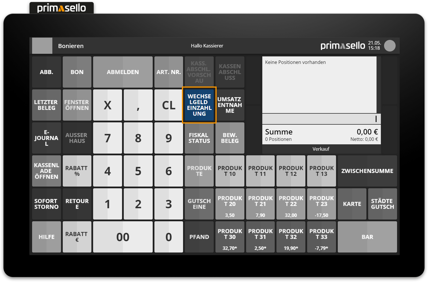 At each cash up, all cash is removed from the register. Before starting the next day, the available change has to be entered into the register.