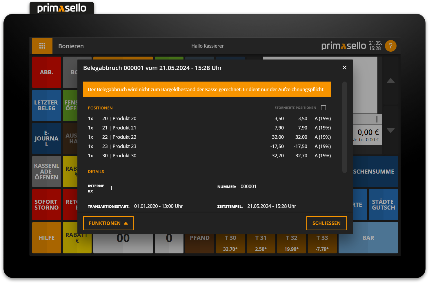 If a receipt is cancelled using the ‘Cancel’ button, a cancellation invoice with a zero total is printed and saved in the electronic journal with all cancelled items.