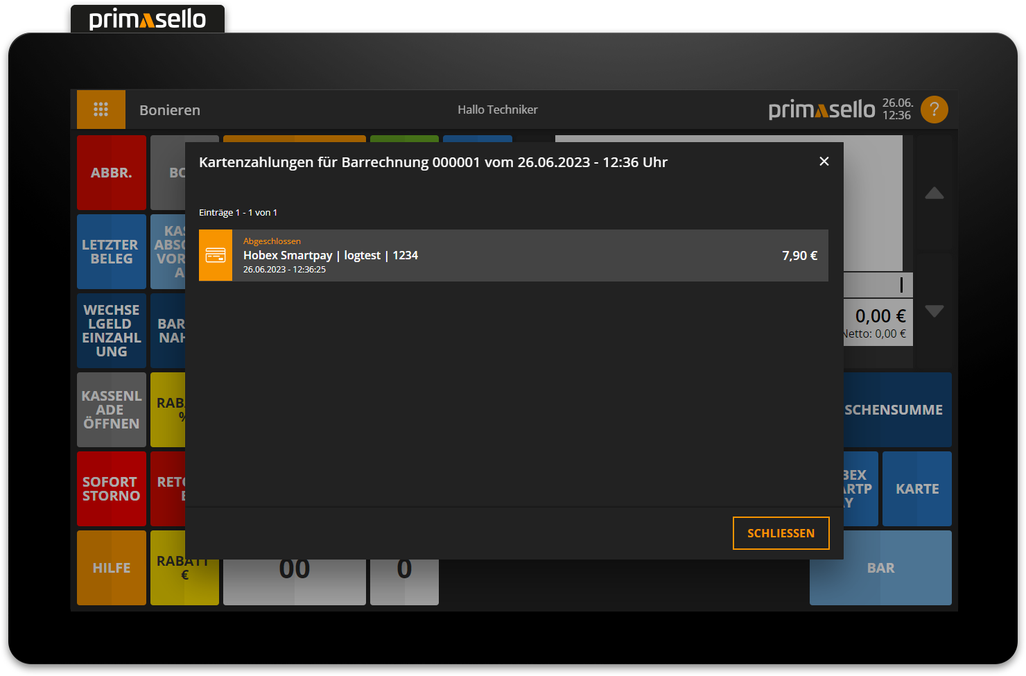 When a partial payment is recorded or the entire receipt is completed with the card payment, the amount to be paid is automatically sent to the card terminal. The customer pays by credit or debit card at the terminal and, once the transaction is completed, the successful payment is sent back to the primasello cash register. The customer receipt from the card terminal is printed and stored in the electronic journal.