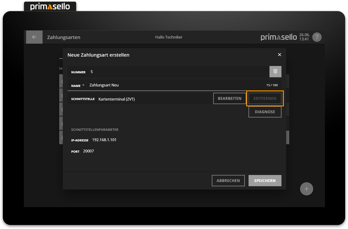 When you delete the card terminal from the payment method, all settings are also deleted. If you want to add the terminal again, you have to reconfigure it.