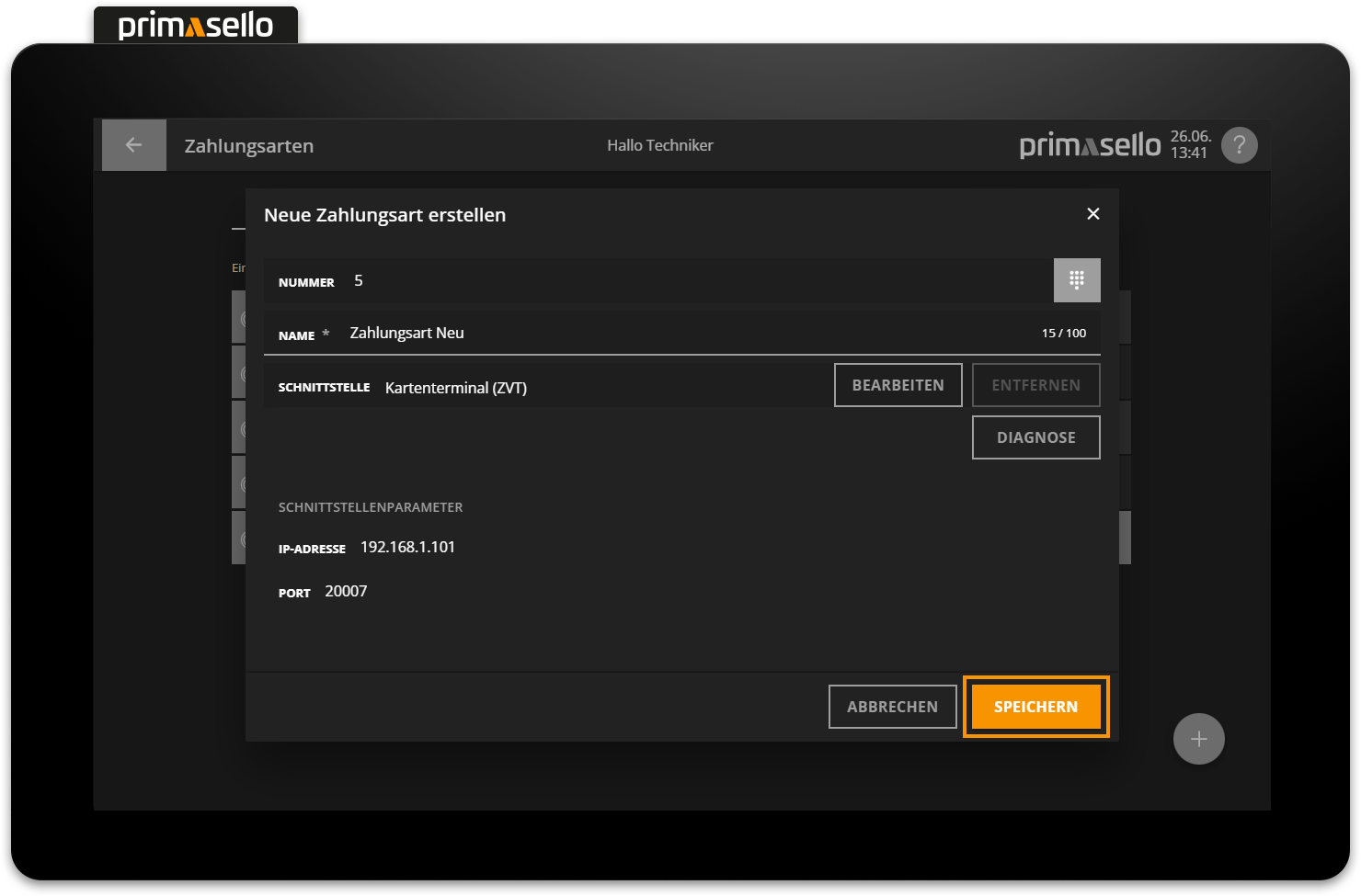 The orange ‘Diagnose' button is located below the ‘Interface' line. This button can be used to check the connection between the card terminal and the primasello cash register at any time. The diagnosis should be carried out especially after changes to the payment method, the internet connection or the terminal have been made.